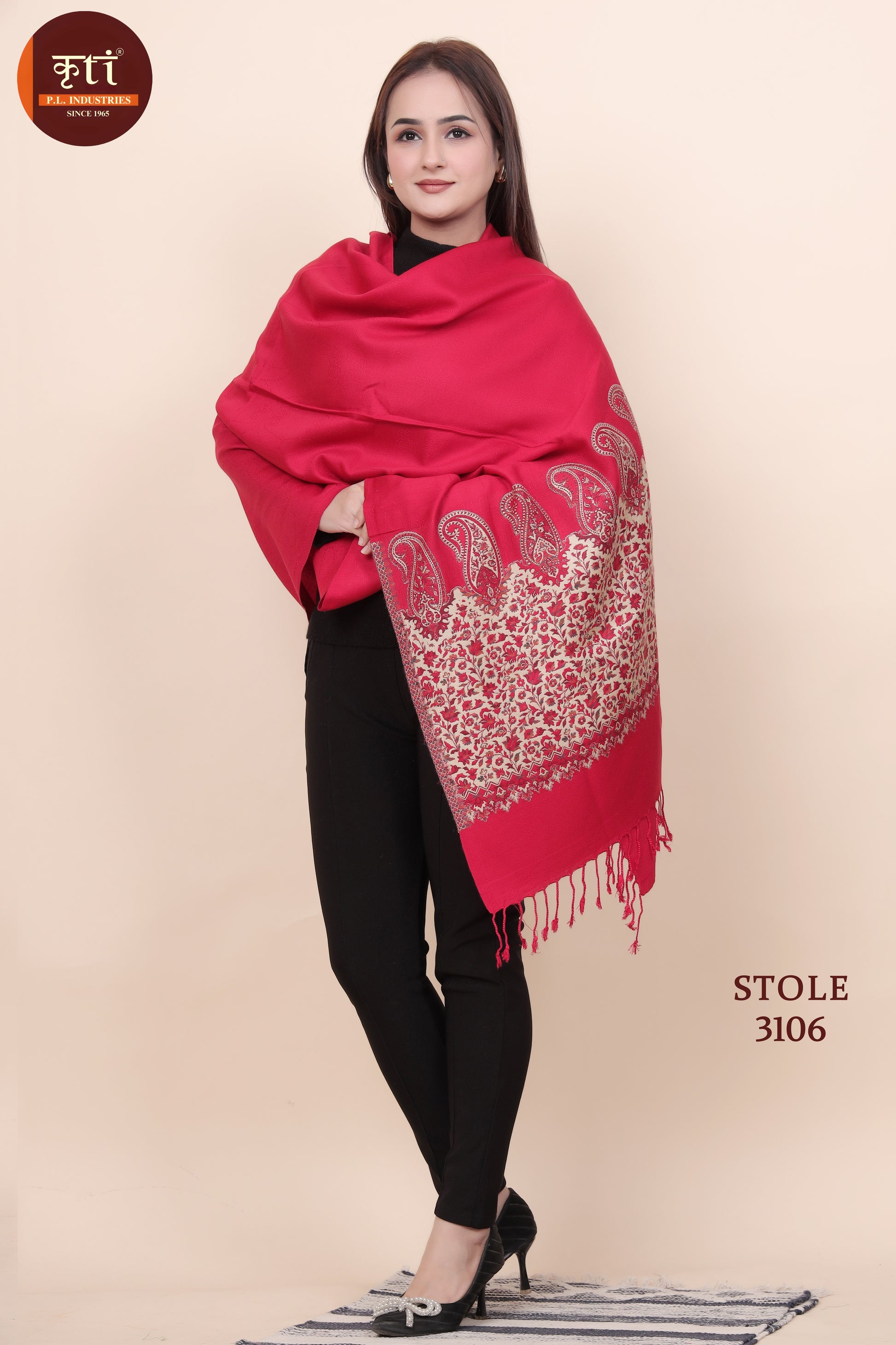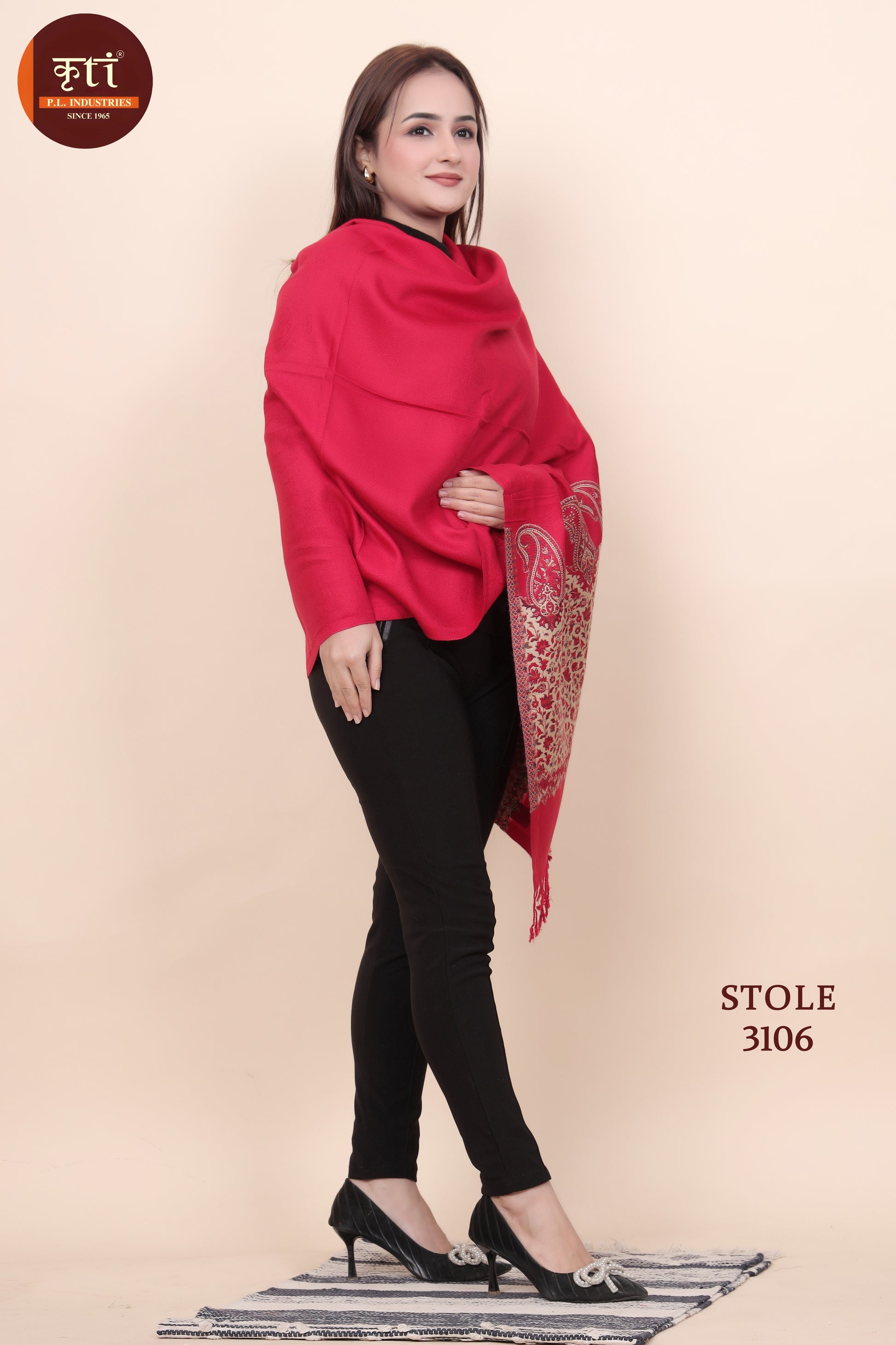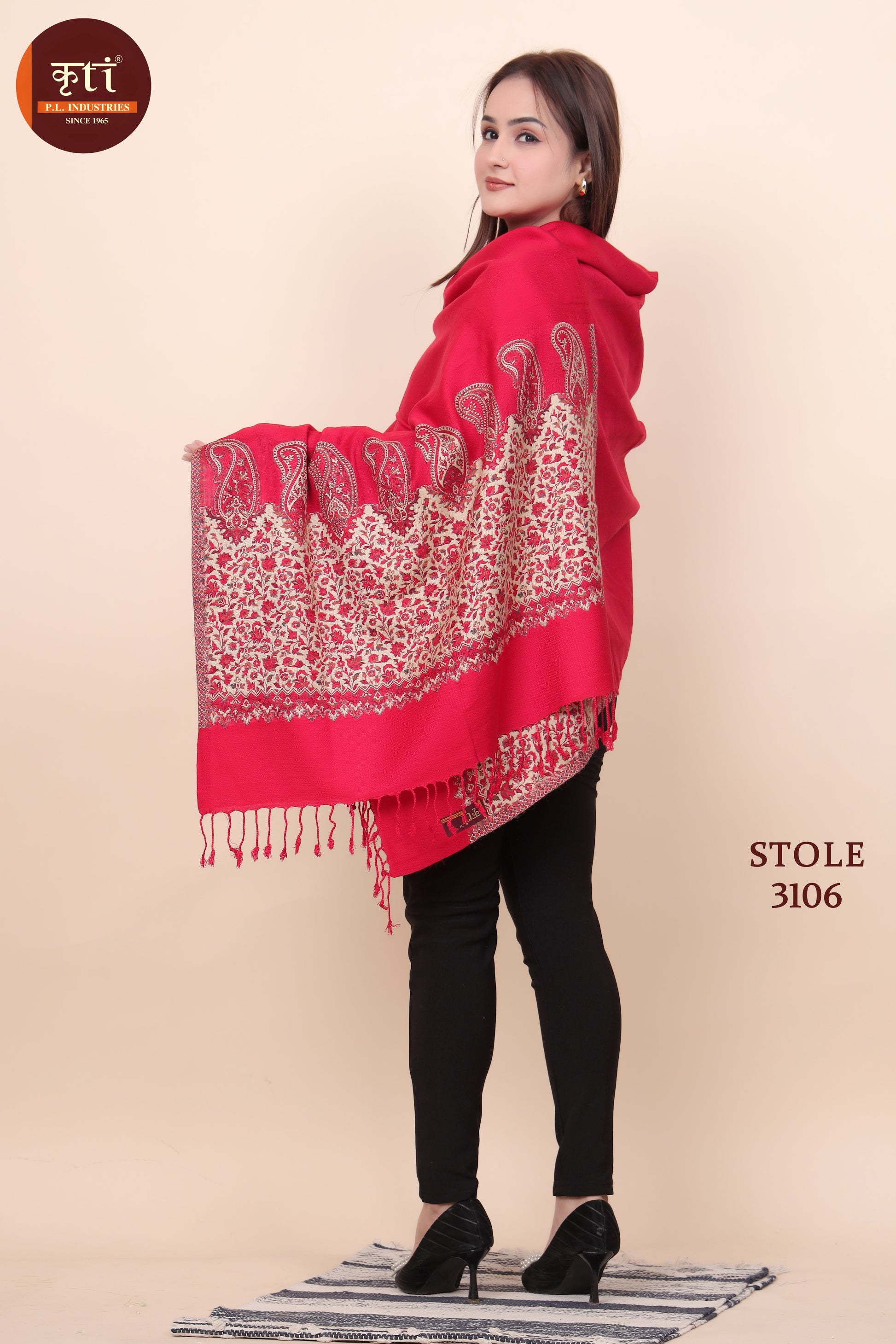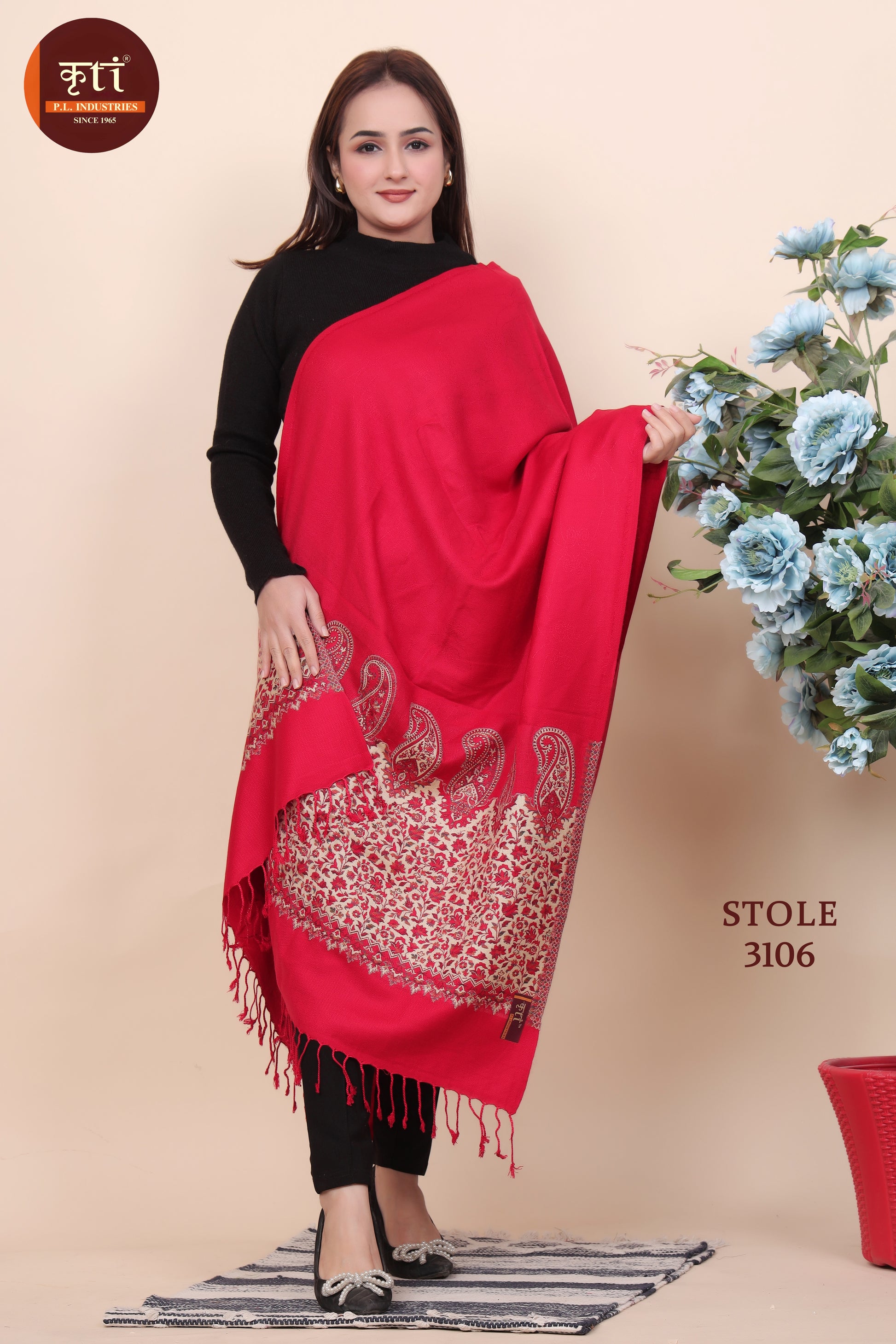 लड़कियों के लिए कृति पैस्ले बॉर्डर ऊनी लाल रंग का स्टोल