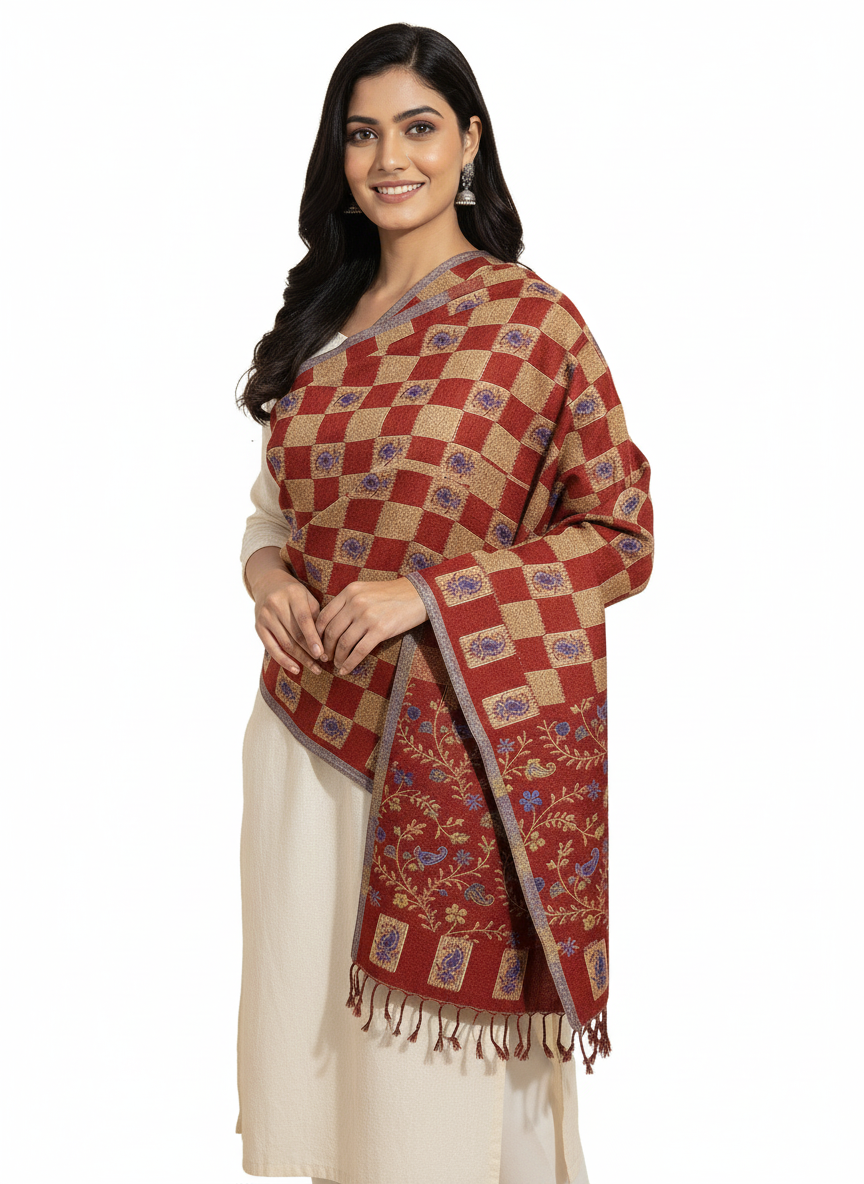 Bring style and warmth together with this elegant woolen stole. Designed with a unique checkered floral pattern in red and beige, highlighted with colorful embroidery and tassel edges, it is a perfect mix of tradition and modern fashion. Soft, cozy, and versatile, this stole enhances any outfit — whether ethnic or western. Ideal for college wear, parties, festive occasions, or everyday elegance.