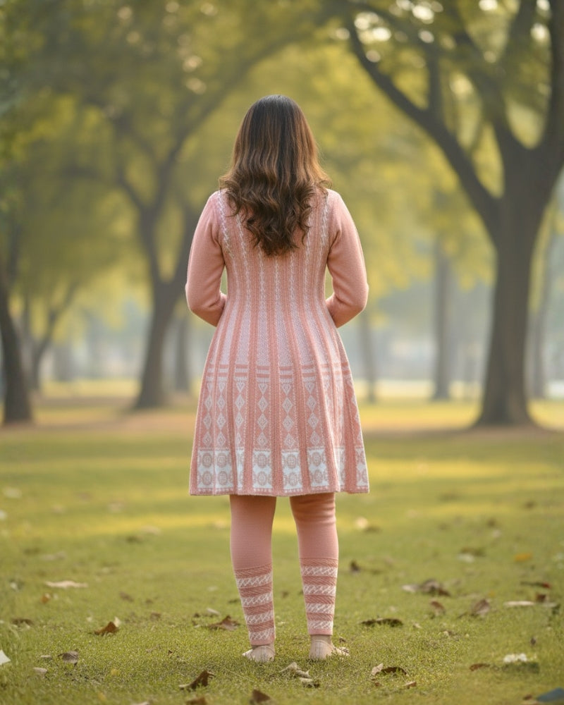 KRITI बुना हुआ ऊनी फ्रॉक कुर्ता सेट | बॉटम वियर के साथ 2-पीस विंटर कुर्ती