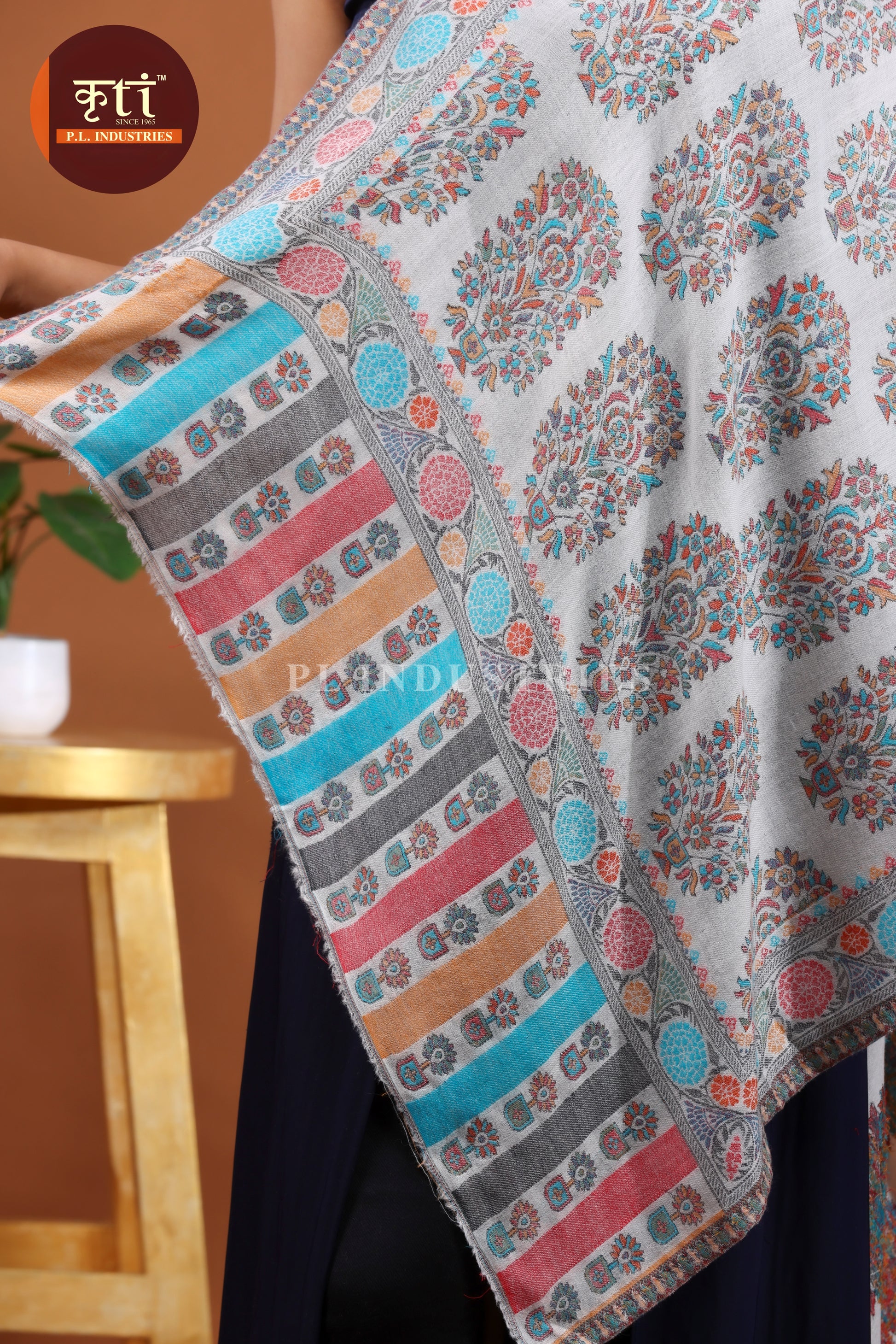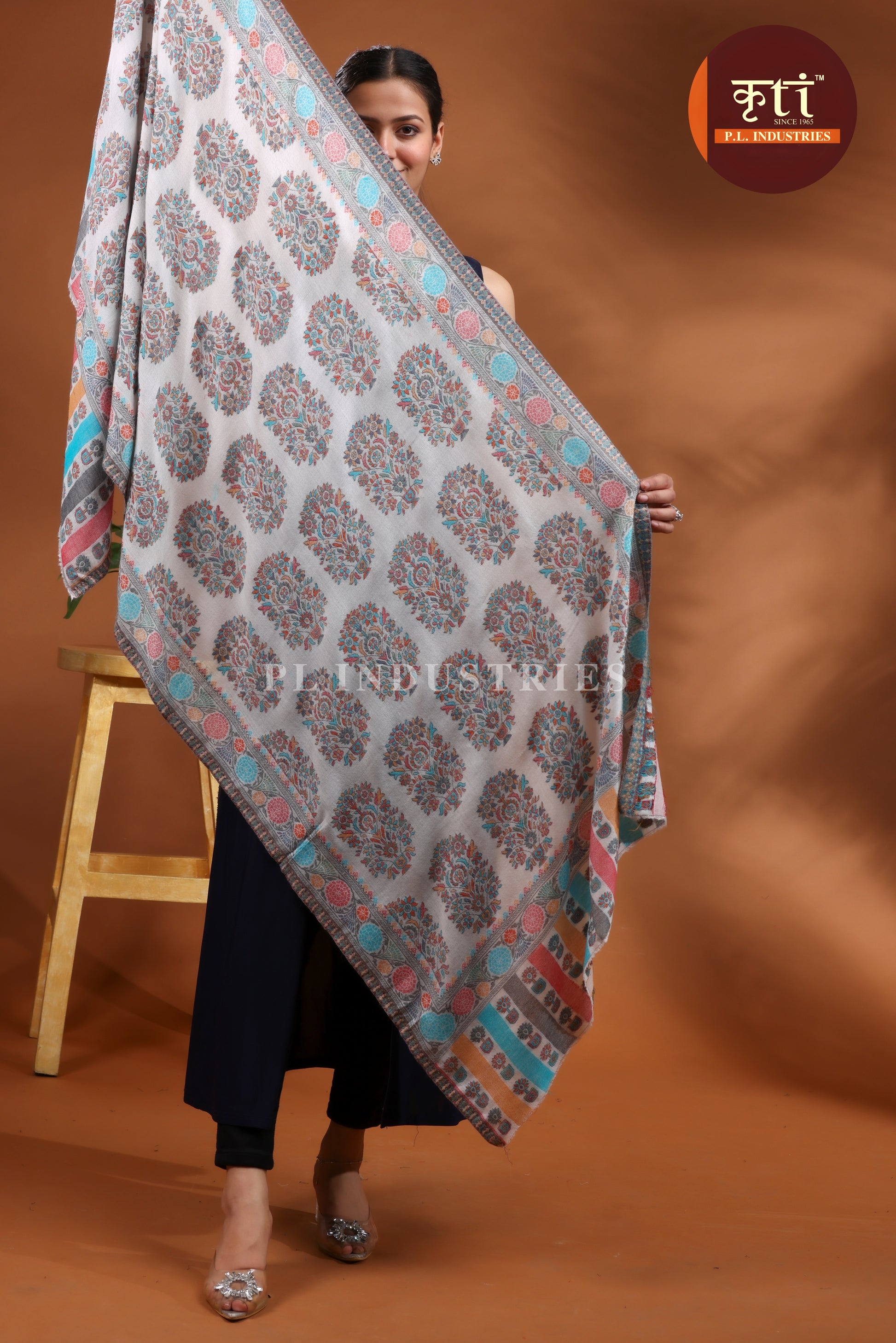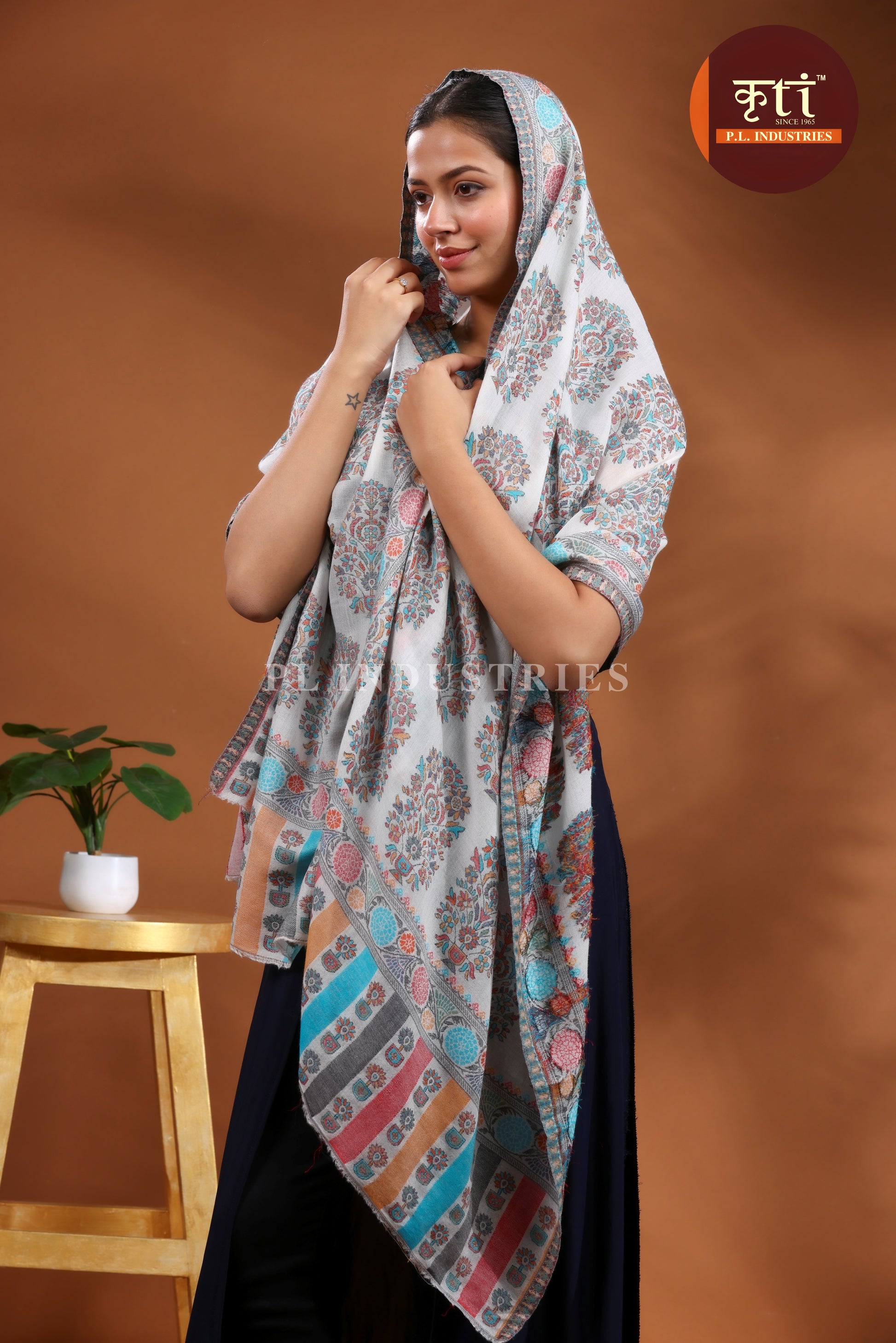 लड़कियों के लिए KRITI प्रीमियम बूटी डिज़ाइन का फाइन वूल ग्रे रंग का स्टोल