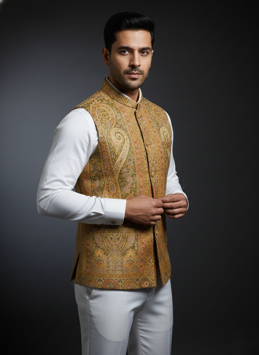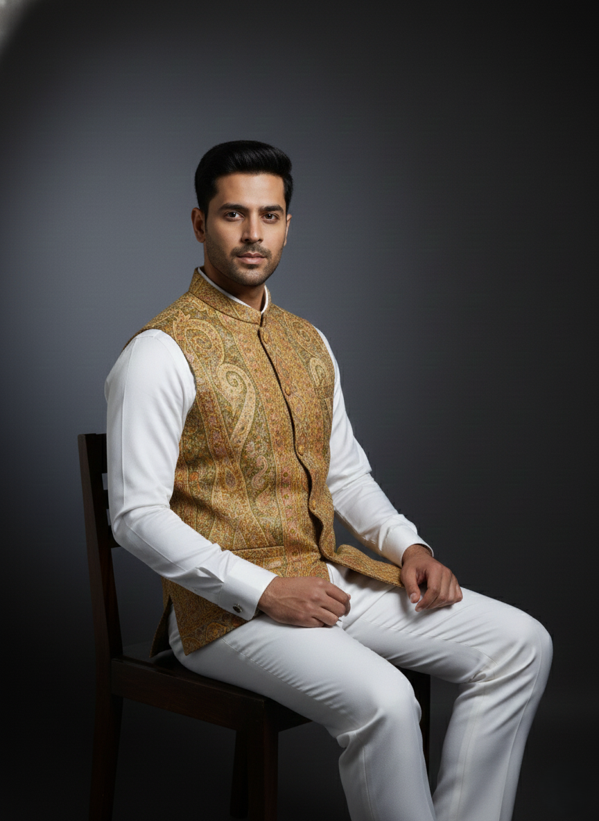 कृति महिलाओं के लिए पारंपरिक कानी डिज़ाइन ऊनी कोट सरसों रंग