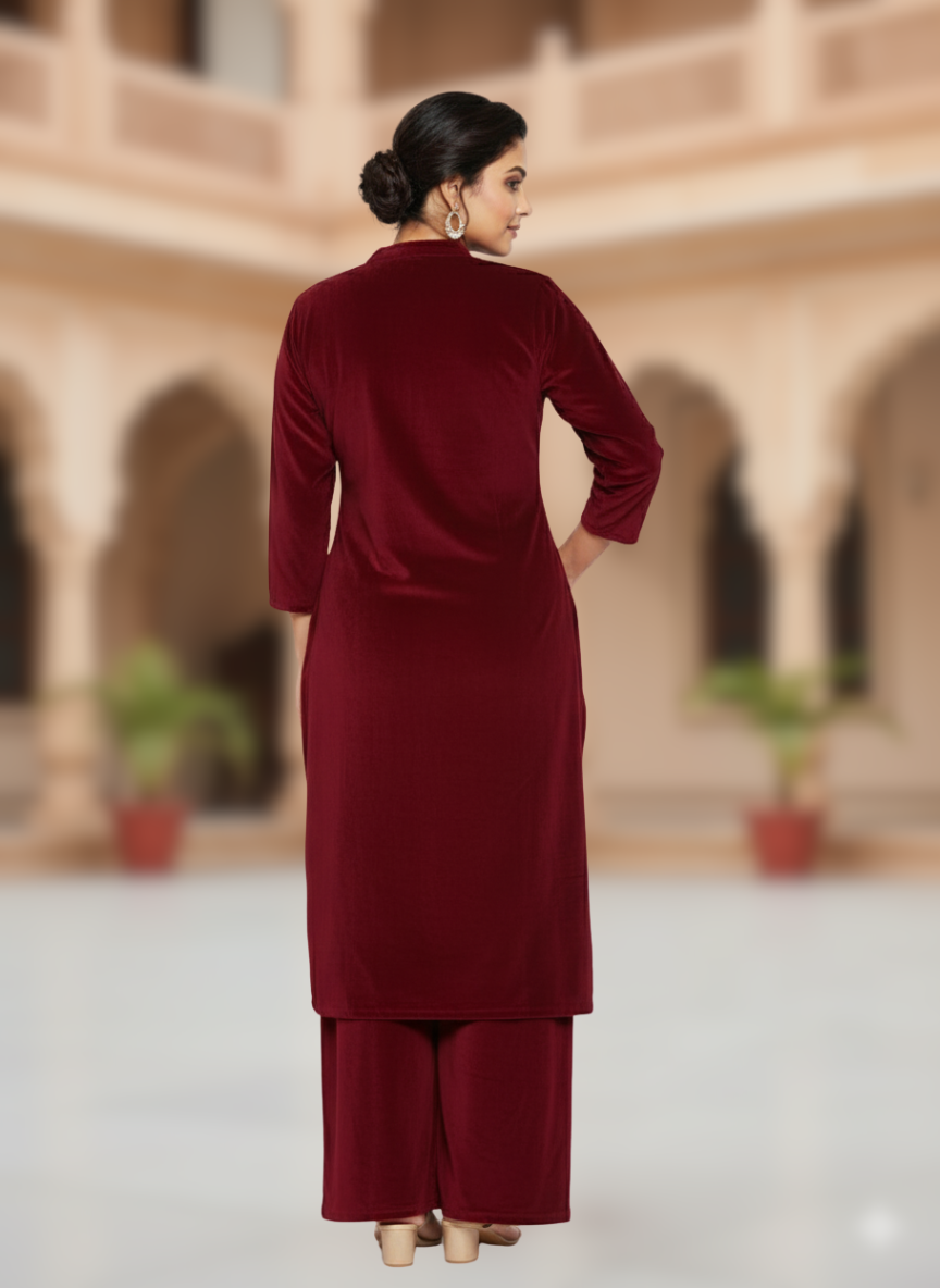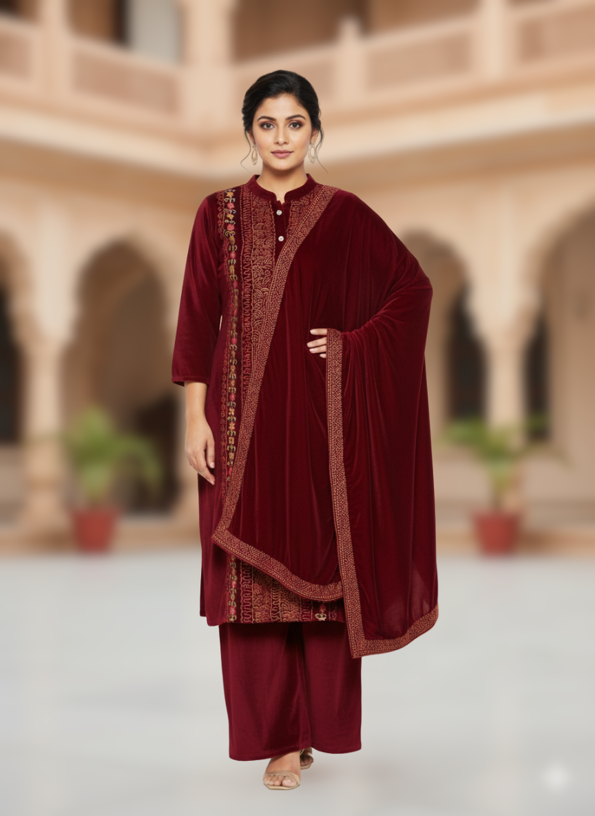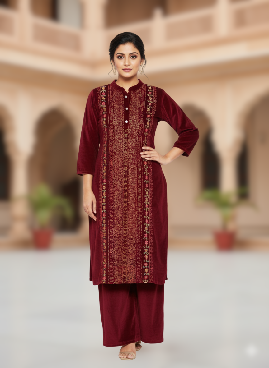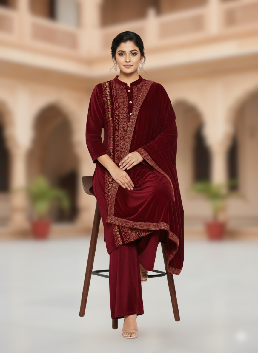 KRITI विंटर वेलवेट 3 पीस कढ़ाई वाली कुर्ती सेट मैरून रंग महिलाओं के लिए