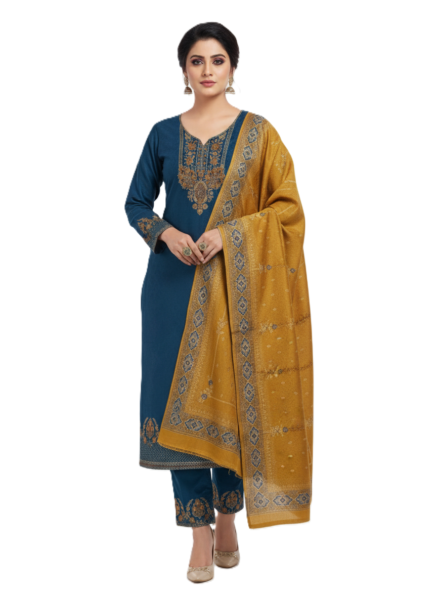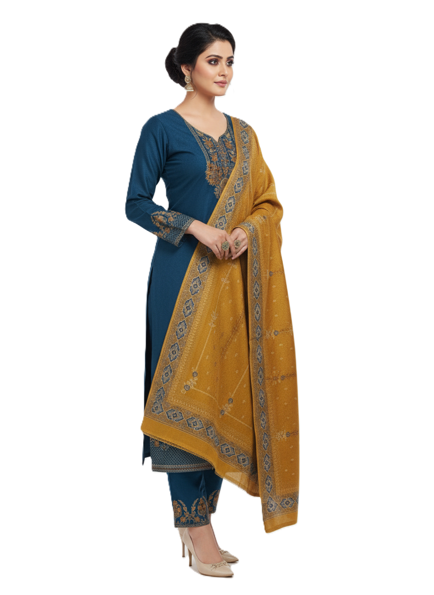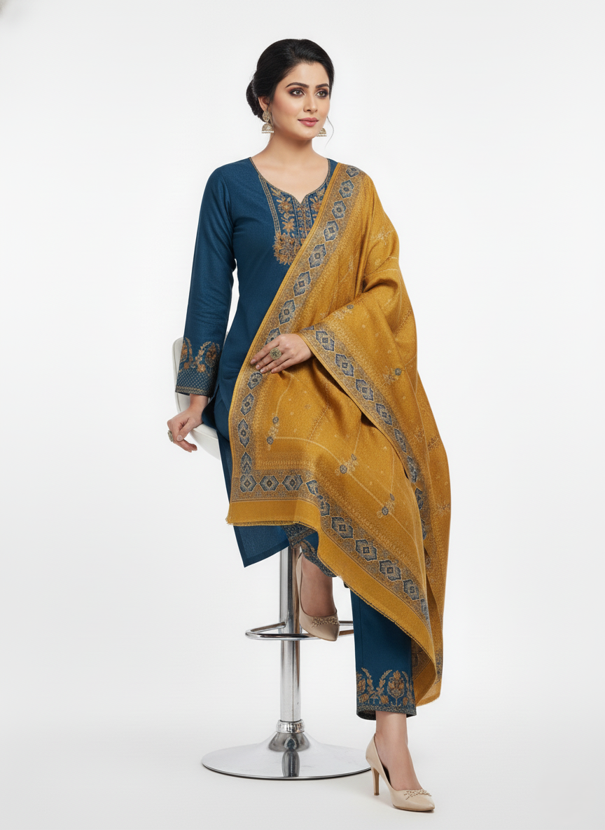 इस खूबसूरत ऊनी अनस्टिच्ड सूट सेट में एक चटक चैती-नीले रंग का कुर्ता और एक खूबसूरत कंट्रास्टिंग मस्टर्ड दुपट्टा है, जो एक शाही शीतकालीन लुक देता है। कुर्ते की नेकलाइन, स्लीव्स और हेम पर जटिल कढ़ाई-शैली की बारीकियाँ हैं, जो इसे एक शानदार उत्सव का एहसास देती हैं। मैचिंग दुपट्टा पारंपरिक बुने हुए रूपांकनों और प्रीमियम बॉर्डर डिज़ाइन को दर्शाता है, जो इसे सर्दियों की शान, उत्सवों और रोज़मर्रा के क्लासी ड्रेसिंग के लिए एकदम सही बनाता है।