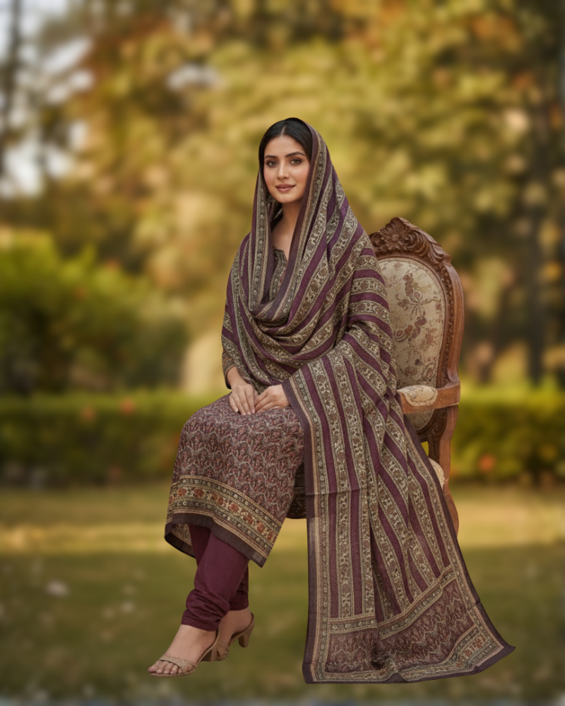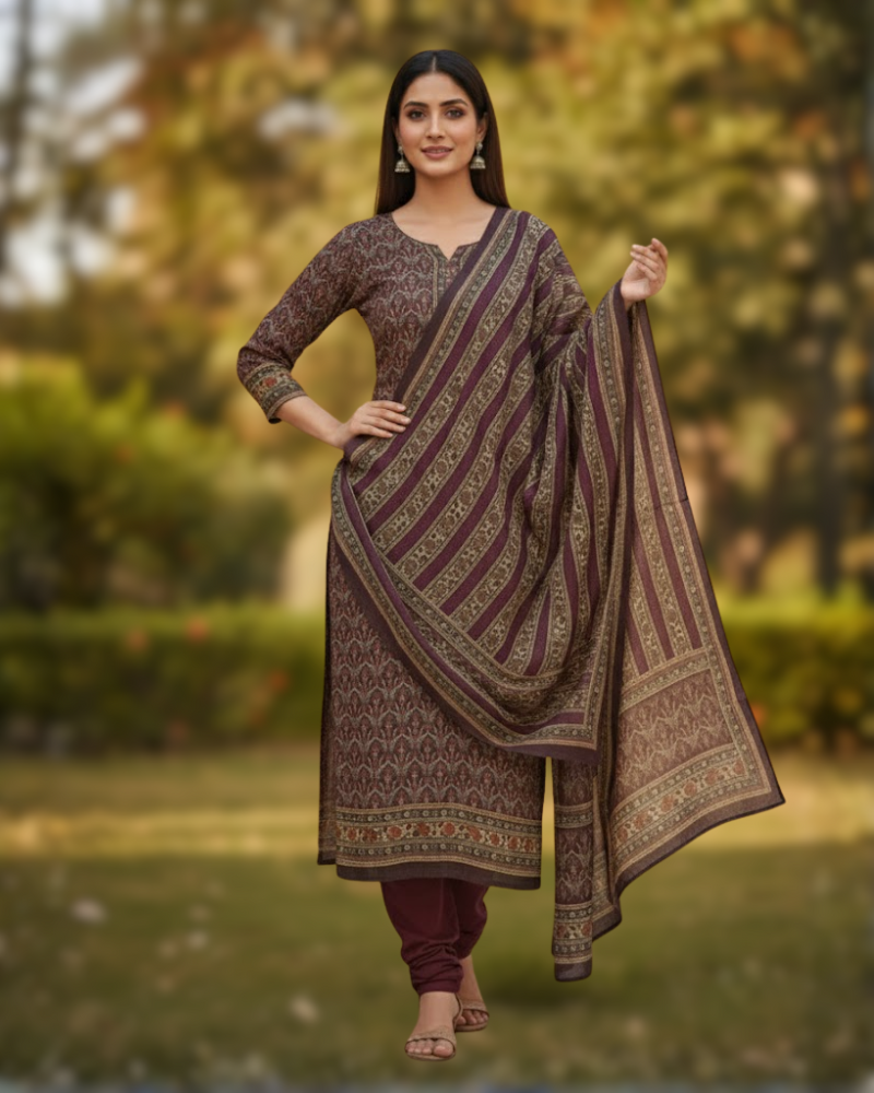 गहरे वाइन-मैरून रंगों में एक प्रीमियम अनस्टिच्ड सूट, जिसे एथनिक प्रिंटेड मोटिफ्स से खूबसूरती से सजाया गया है। कुर्ते में नाज़ुक डिटेलिंग और मैचिंग स्लीव बॉर्डर के साथ एक परिष्कृत नेकलाइन दिखाई देती है, जबकि दुपट्टे में आधुनिक ड्रेप प्रभाव के लिए सुंदर विकर्ण धारियाँ हैं। उत्सव समारोहों, शाम के समारोहों और सुंदर पारंपरिक स्टाइल के लिए बिल्कुल सही - यह डिज़ाइन एक समकालीन स्पर्श के साथ एक कालातीत आकर्षण प्रदान करता है।