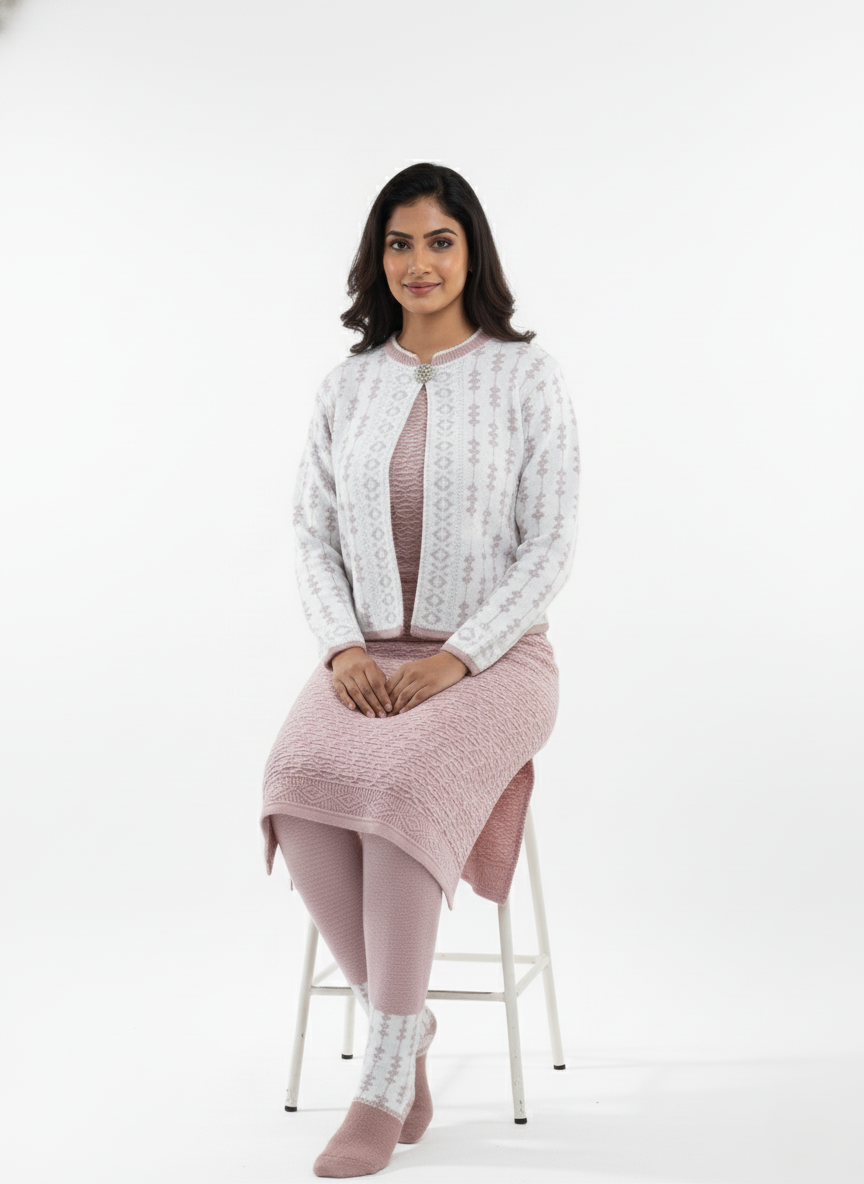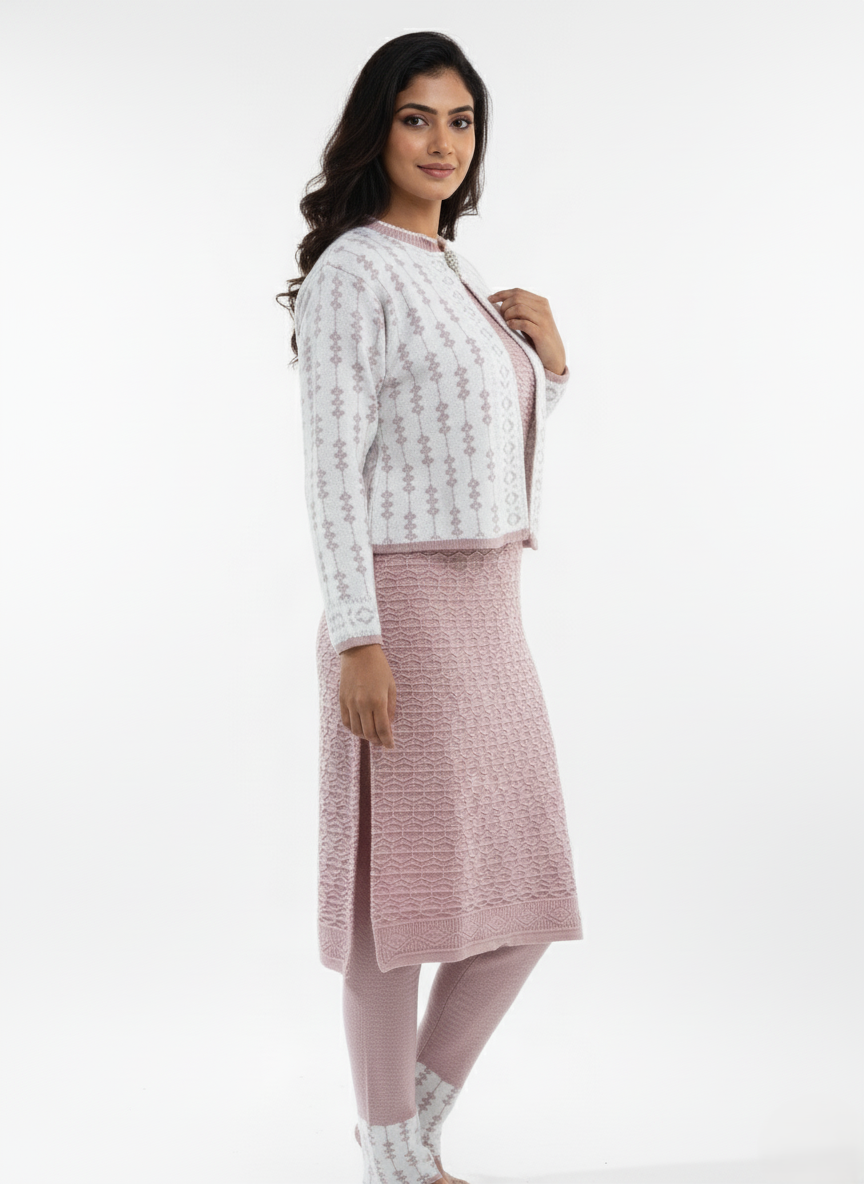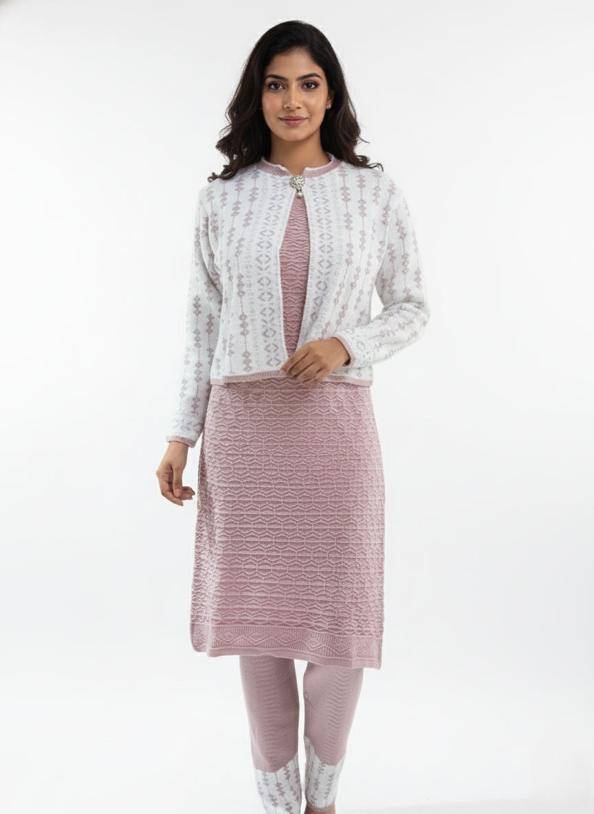 हमारे शानदार 3-पीस कुर्ती सेट (टॉप, बॉटम और जैकेट) के साथ एक खूबसूरत रंग में आरामदायक और सुरुचिपूर्ण ढंग से बाहर निकलें। यह पहनावा एक मुलायम, सर्दियों के लिए उपयुक्त बुनाई से कुशलता से तैयार किया गया है - एक प्रीमियम "हेयर फ़ैब्रिक" जो स्टाइल से समझौता किए बिना एक आलीशान एहसास और आरामदायक गर्माहट प्रदान करता है। ठंडे मौसम में बदलाव के लिए या एक स्टाइलिश, आरामदायक एथनिक लुक के लिए बिल्कुल सही।