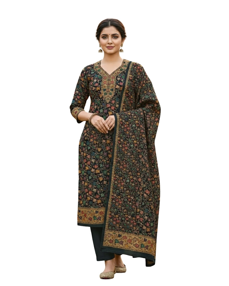KRITI महिलाओं के लिए फ्लोरल डिज़ाइन ऊनी काला हरा रंग अनस्टिच्ड फ़ैब्रिक सूट सेट विंटरवियर