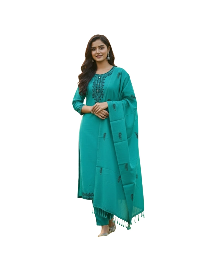 KRITI ऊनी कढ़ाई वाला सिला हुआ सूट फिरोजी रंग महिलाओं के लिए सर्दियों के लिए