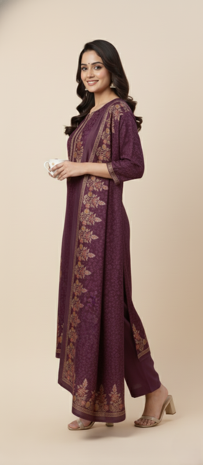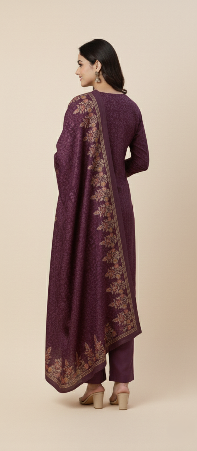 महिलाओं के लिए बैंगनी रंग में कृति ऊनी प्रिंट अनटिच्ड विंटर सूट
