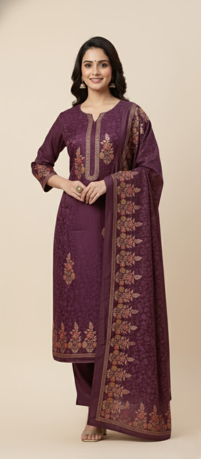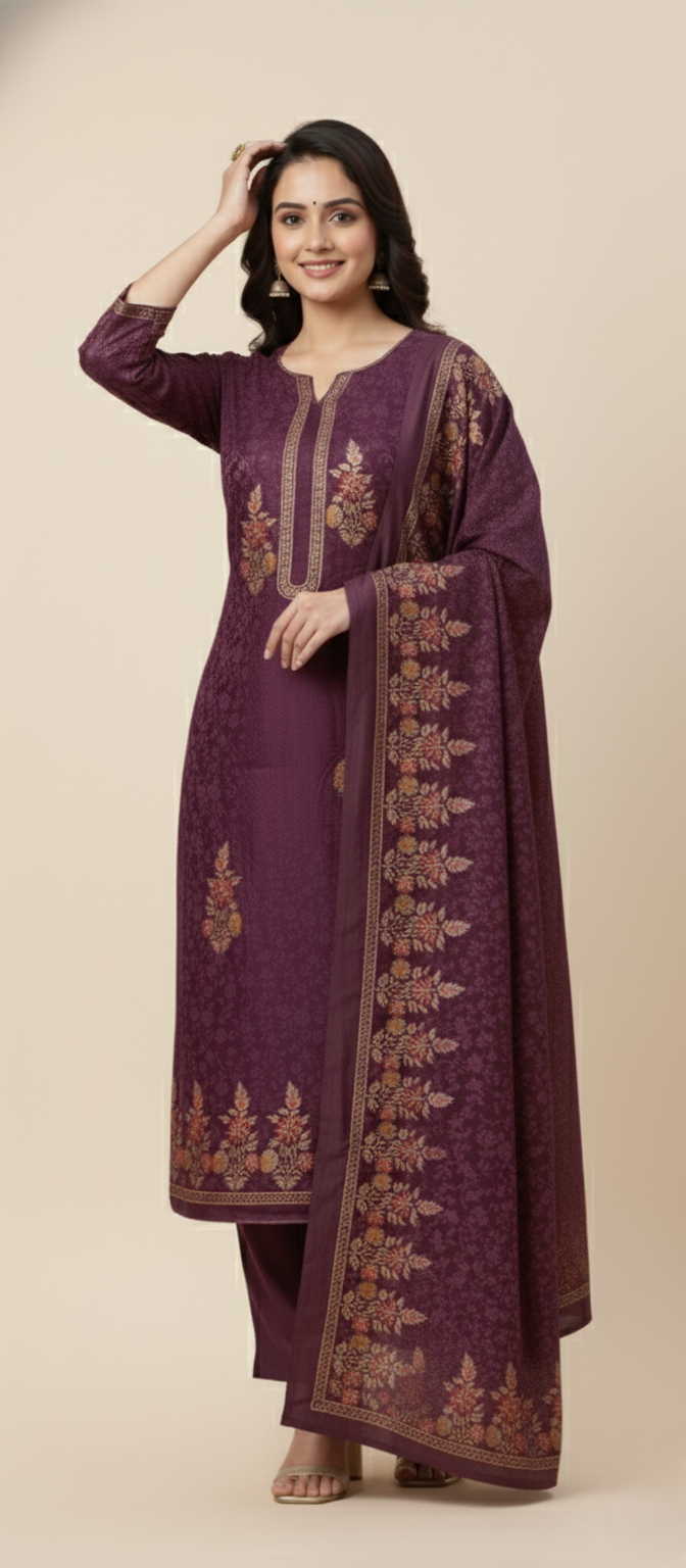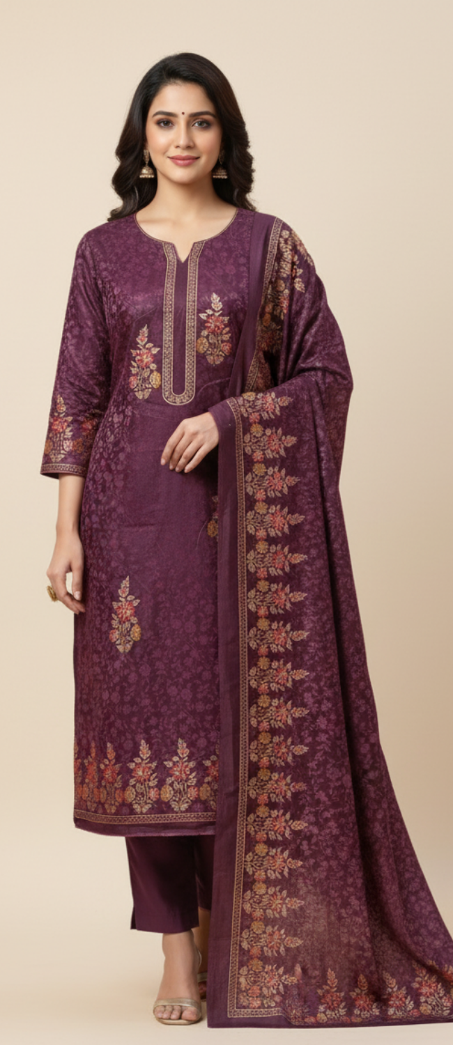 इस समृद्धि प्लम पर्पल अनस्टिच्ड वूलन प्रिंट सूट के साथ अपने विंटर वॉर्डरोब में शाही आकर्षण जोड़ें। शानदार मुलायम ऊनी कपड़े से तैयार, इसमें जटिल फ्लोरल प्रिंट और विस्तृत नेक एम्ब्रॉयडरी से प्रेरित डिज़ाइन है। सुरुचिपूर्ण बॉर्डर वर्क और कोऑर्डिनेटेड बॉटम फ़ैब्रिक वाला मैचिंग दुपट्टा इस समृद्ध और कालातीत लुक को पूरा करता है। उत्सवों, ऑफिस वियर या सर्दियों के उत्सवों के लिए बिल्कुल सही, यह आराम के साथ शुद्ध परिष्कार को दर्शाता है।