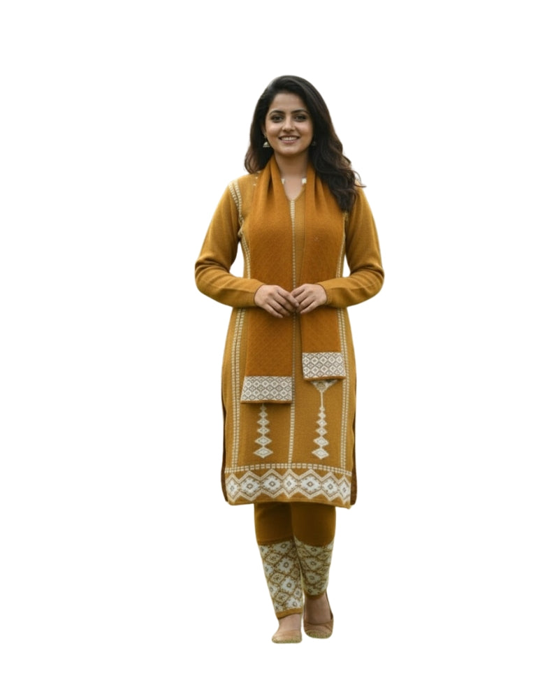 प्रीमियम 3-पीस ऊनी विंटर कुर्ती सेट | बॉटम और स्टोल के साथ बुना हुआ कुर्ता | M-XXL साइज़
