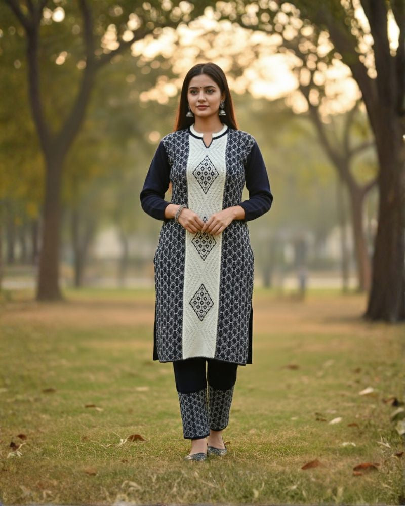 प्रीमियम 3-पीस ऊनी विंटर कुर्ती सेट | बॉटम और स्टोल के साथ बुना हुआ कुर्ता | M-XXL साइज़