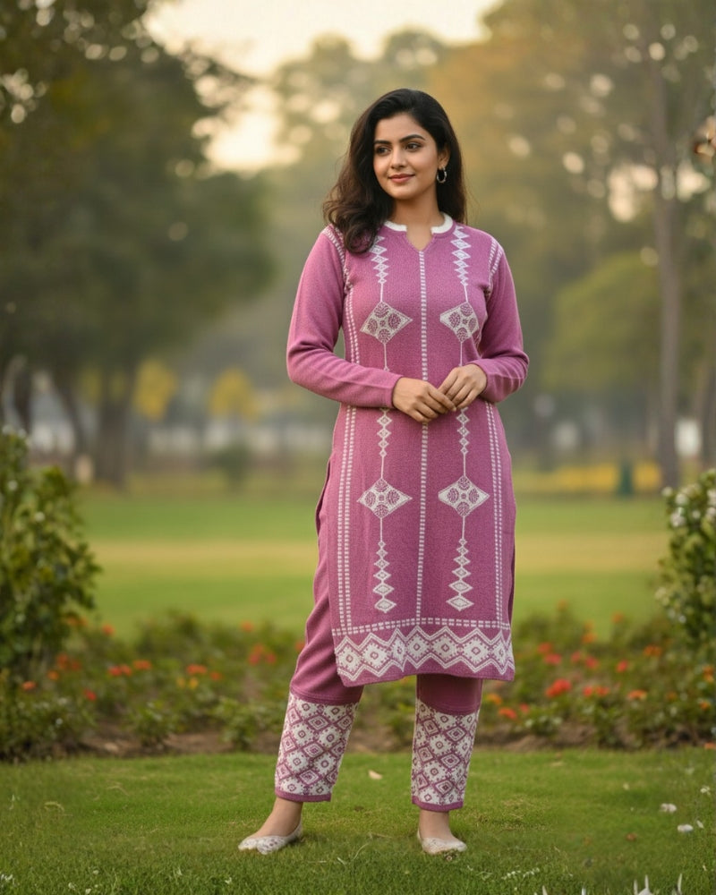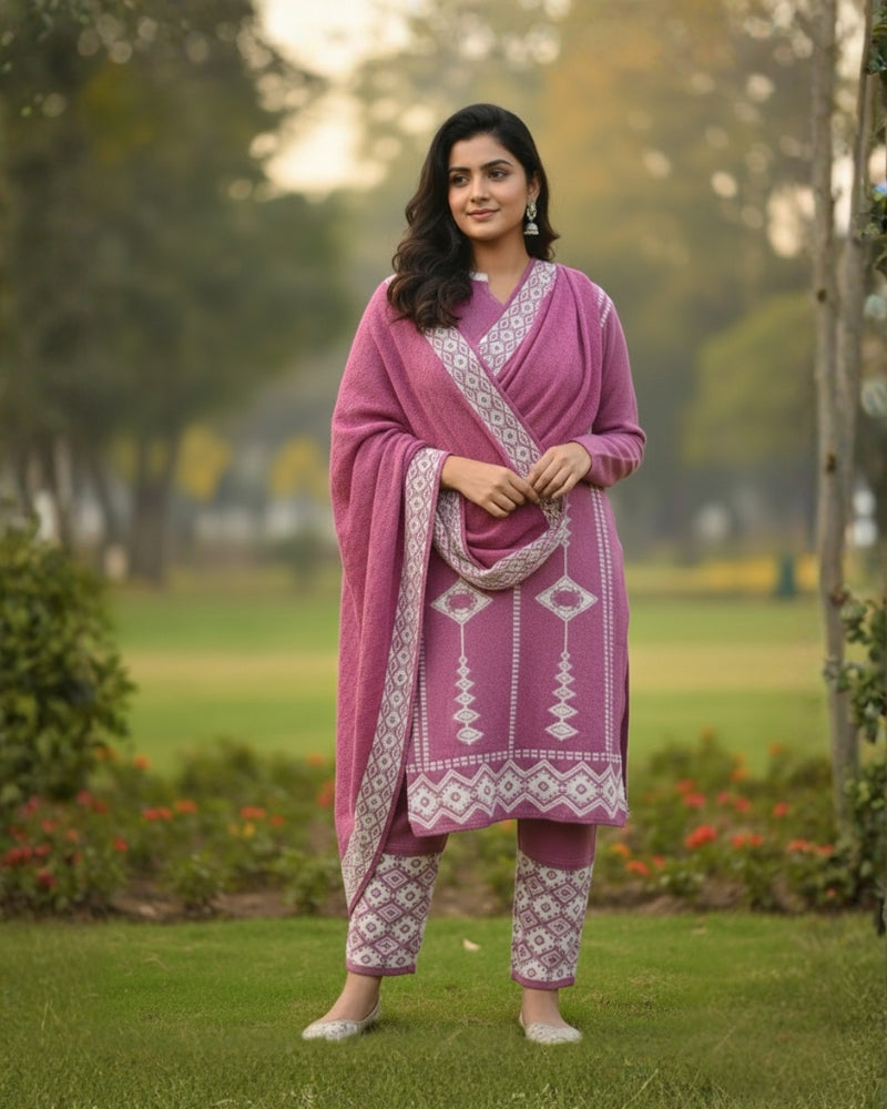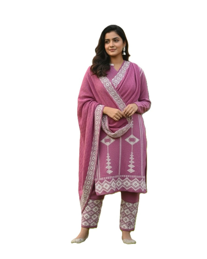 प्रीमियम 3-पीस ऊनी विंटर कुर्ती सेट | बॉटम और स्टोल के साथ बुना हुआ कुर्ता | M-XXL साइज़