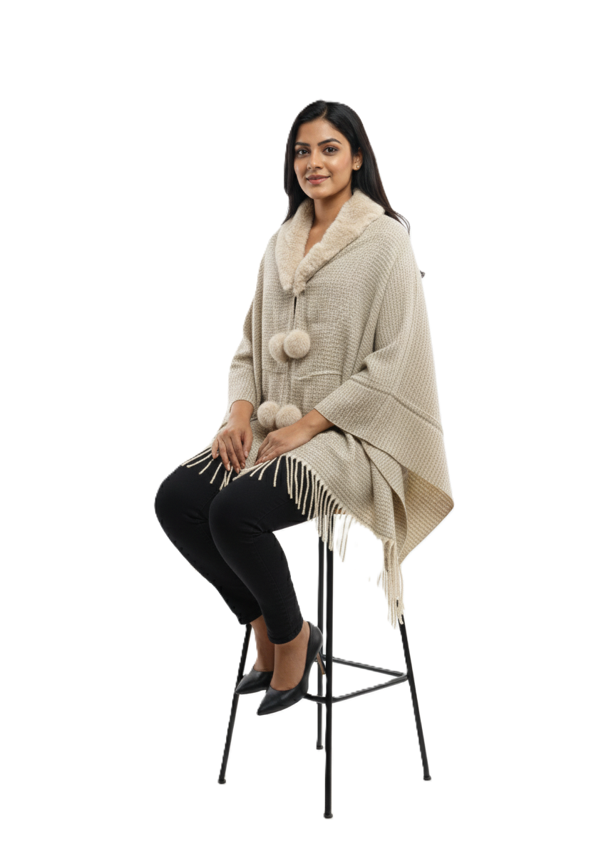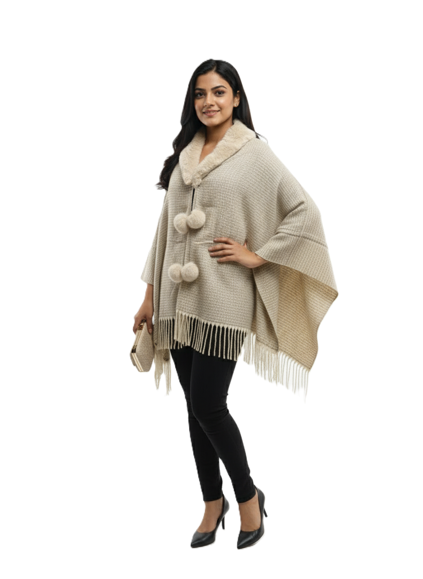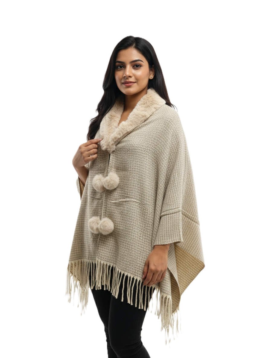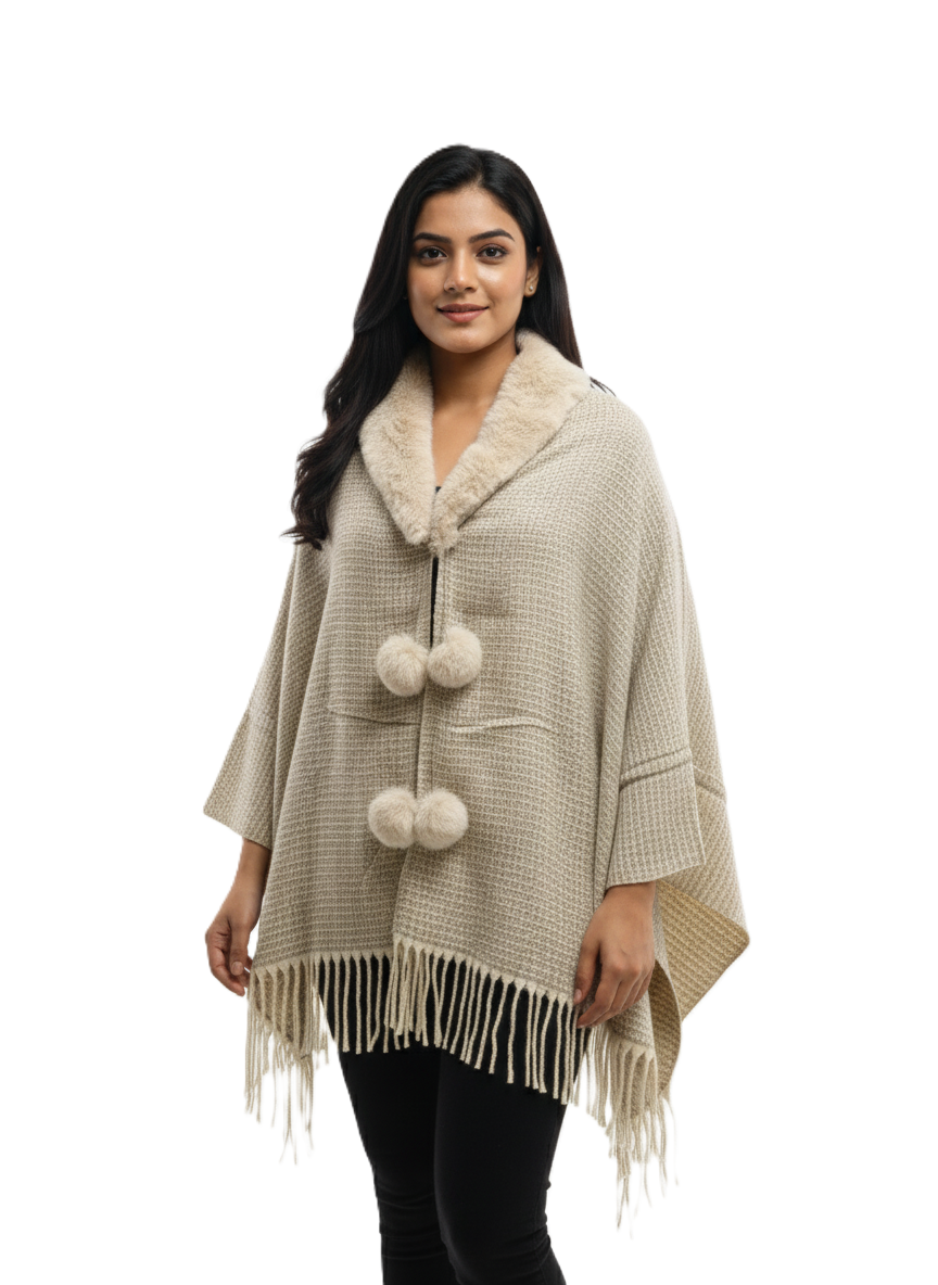 इस खूबसूरत फॉक्स फर कॉलर पोंचो के साथ आराम और स्टाइल के बेहतरीन मिश्रण का आनंद लें। यह शानदार ओपन-फ्रंट रैप किसी भी आउटफिट को तुरंत निखार देता है, जिससे यह ठंड के महीनों के लिए एक ज़रूरी एक्सेसरी बन जाता है।
