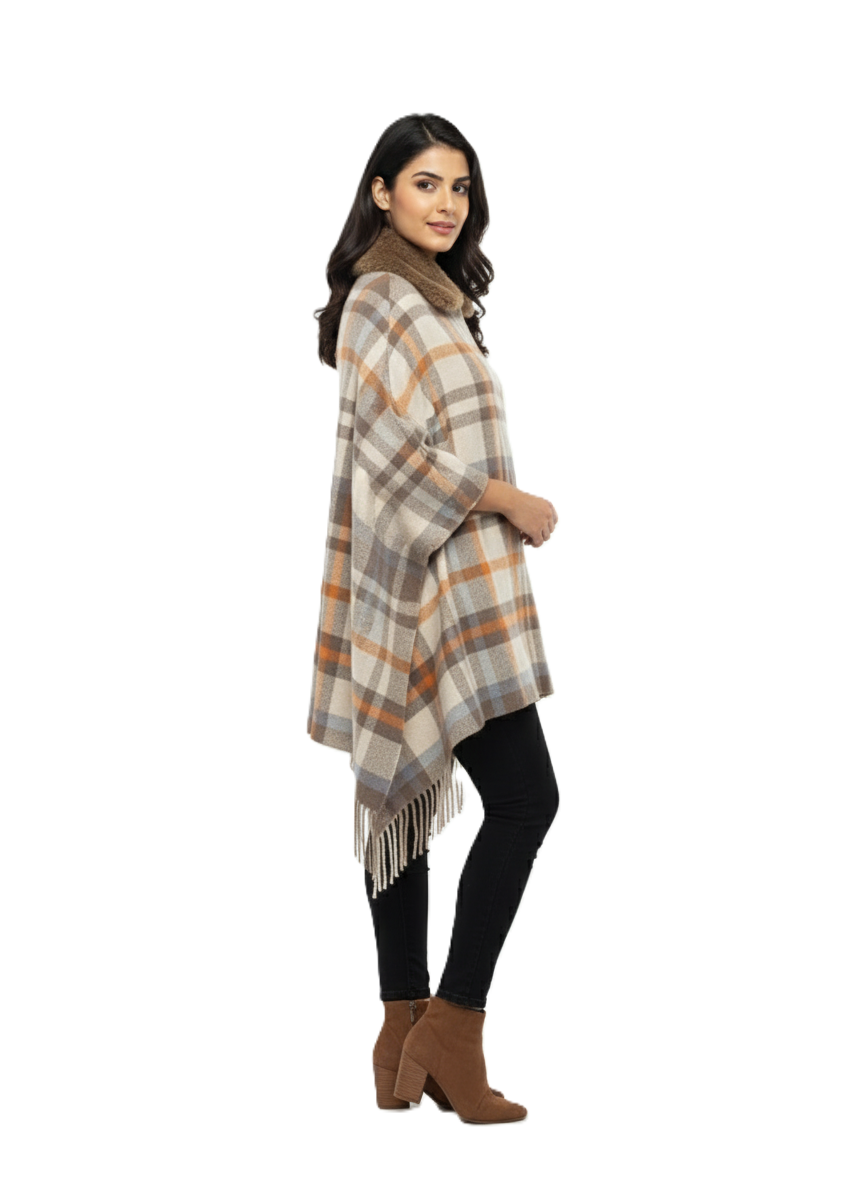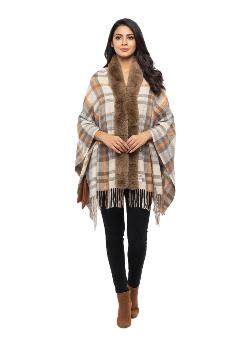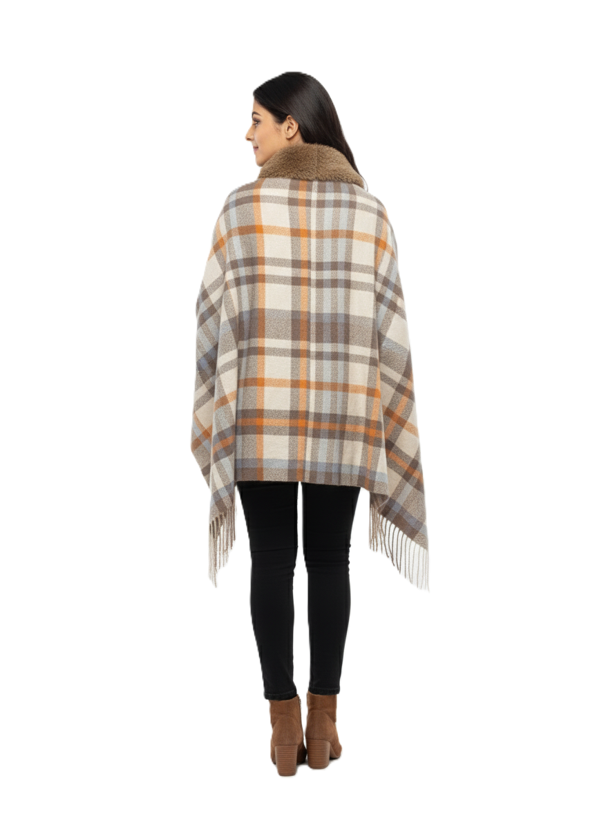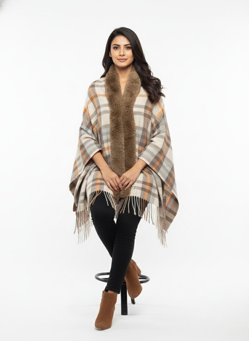 महिलाओं के लिए शानदार चेक पोंचो केप, कृत्रिम फर कॉलर के साथ | सर्दियों के लिए गर्म ऊनी मिश्रण रैप