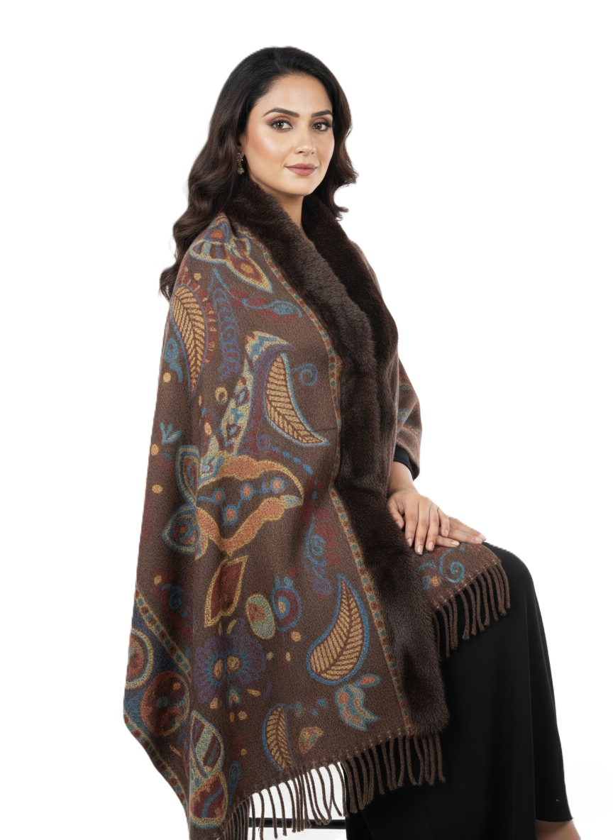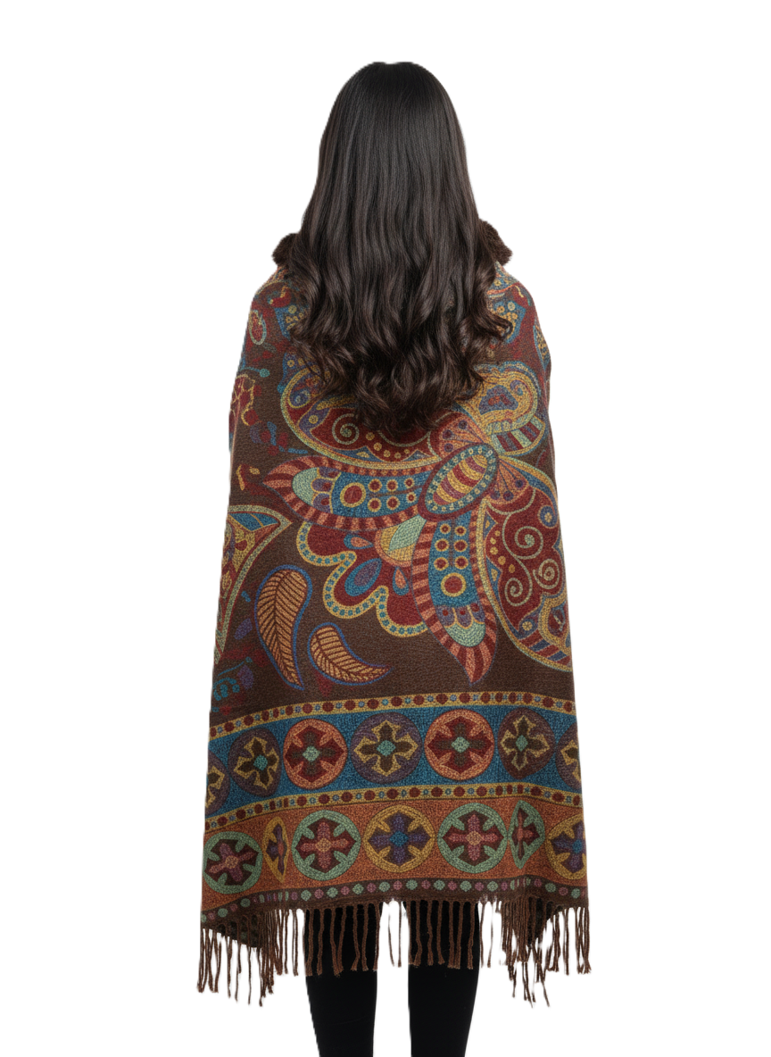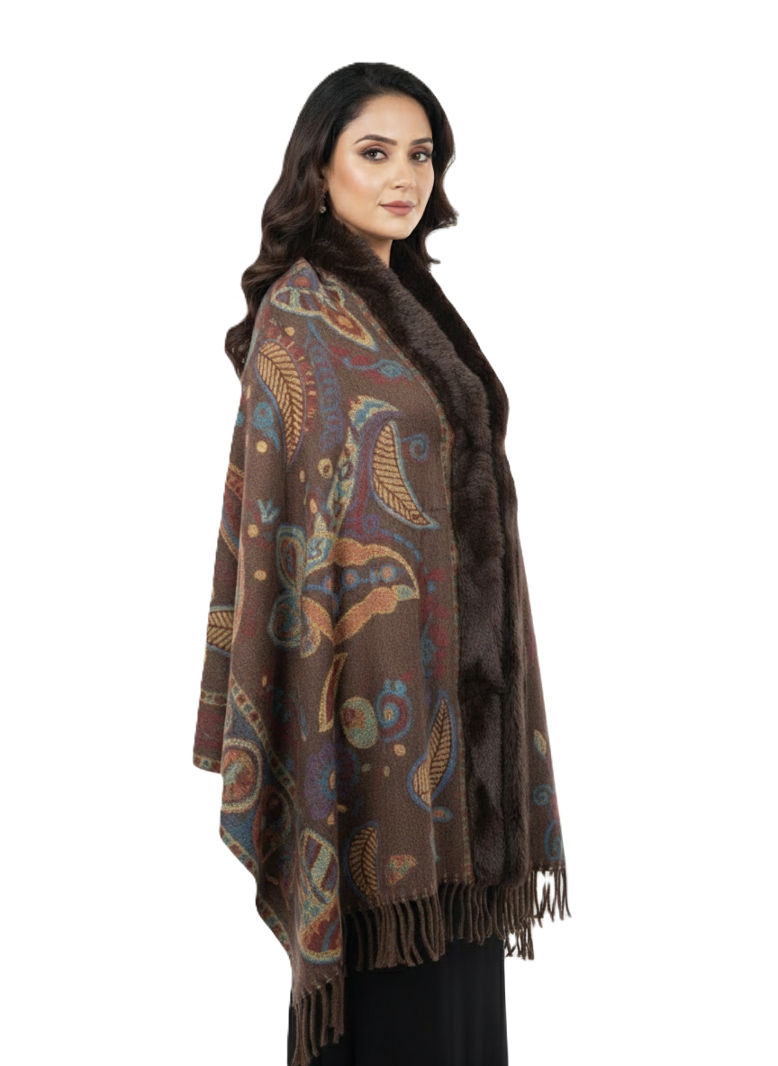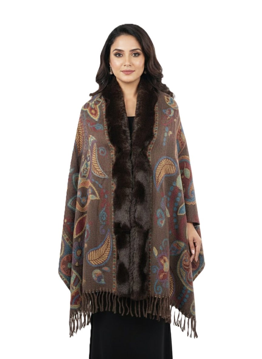 महिलाओं के लिए शानदार पैस्ले प्रिंटेड पोंचो केप, फॉक्स फर ट्रिम के साथ | गर्म बहुरंगी ऊनी मिश्रण आउटरवियर