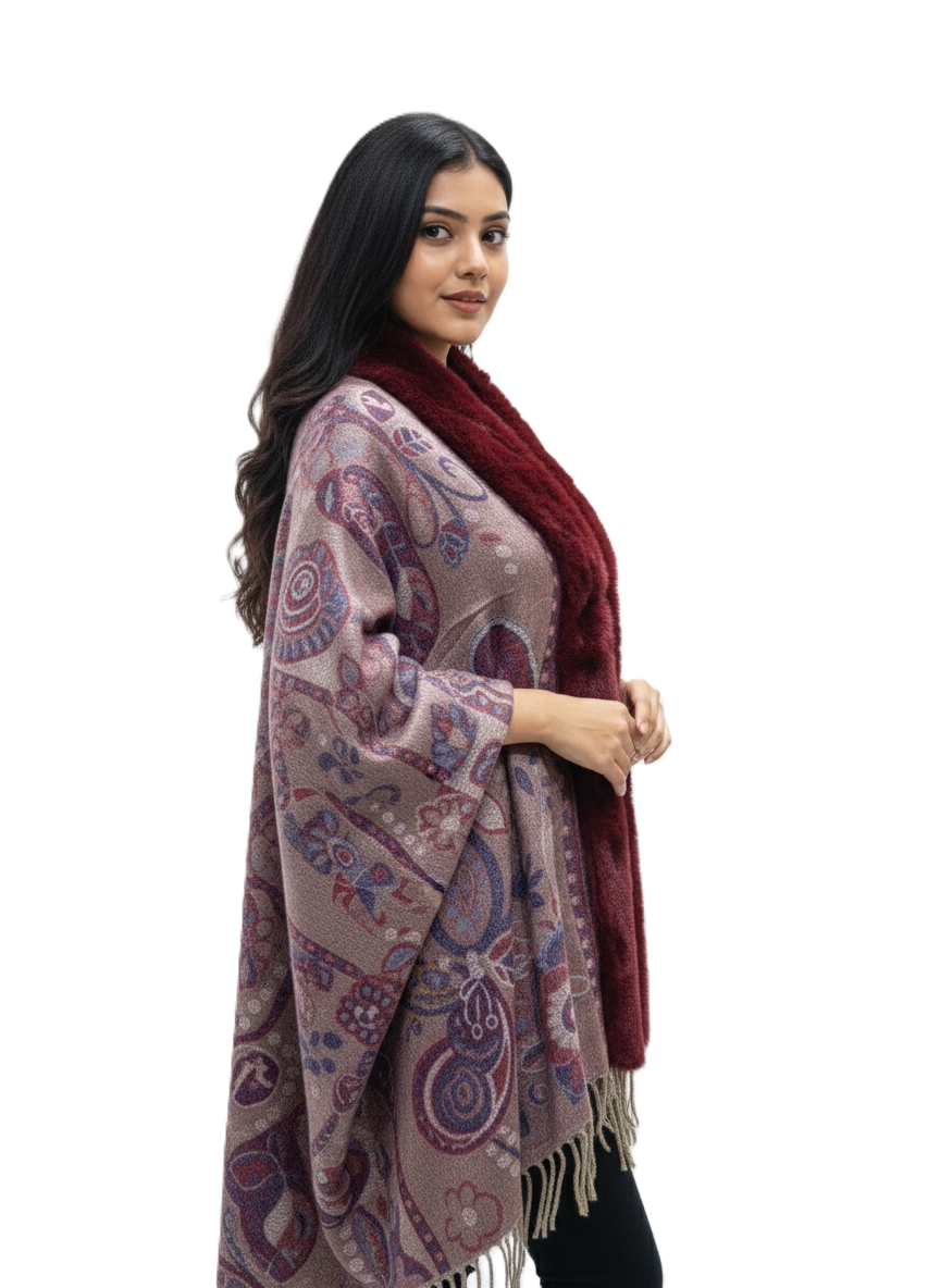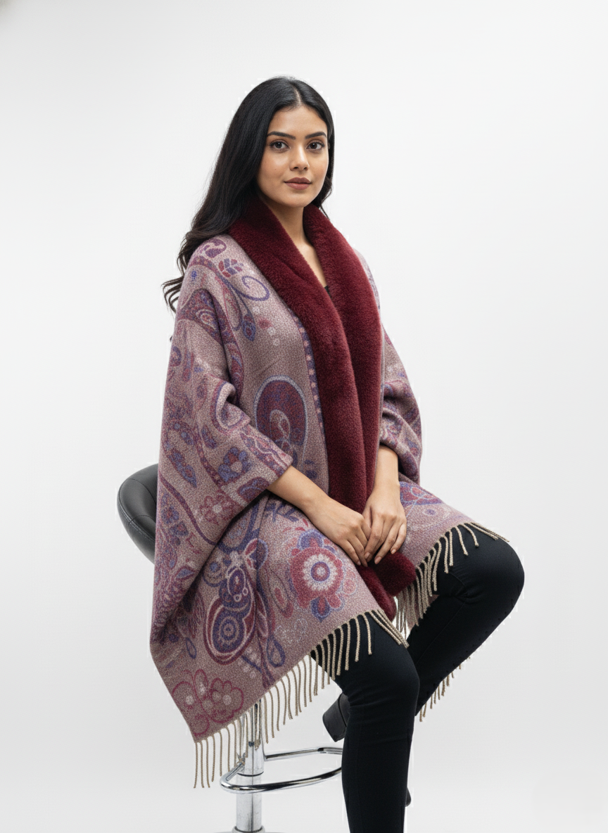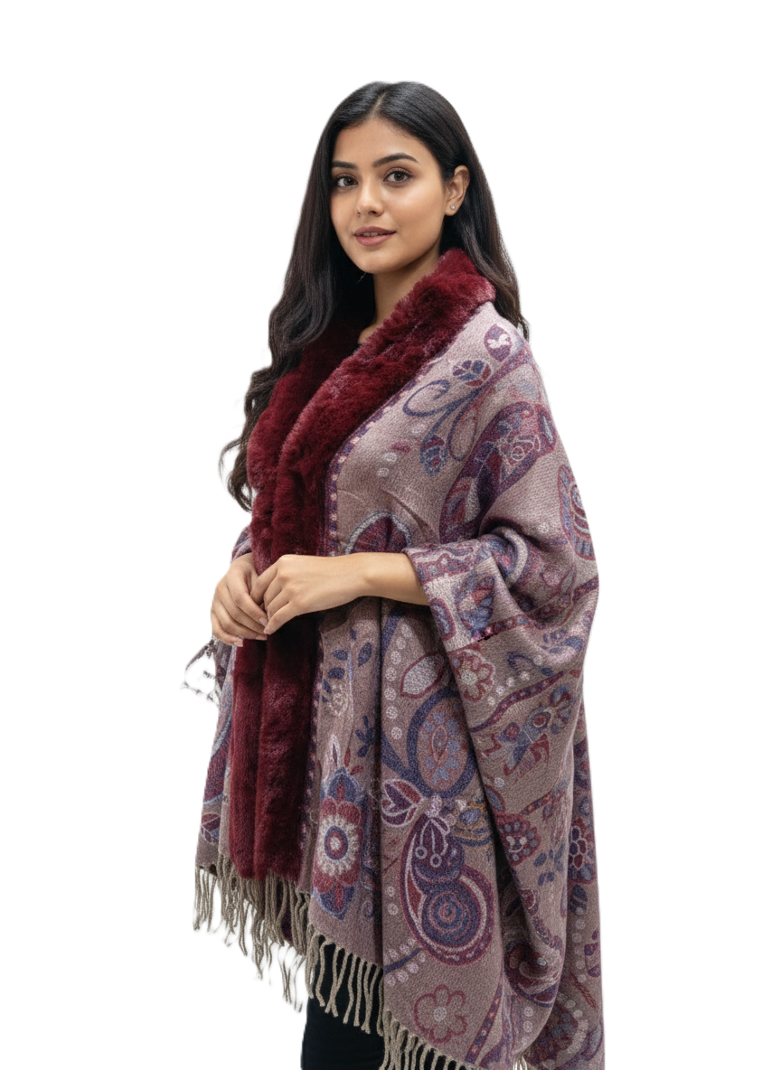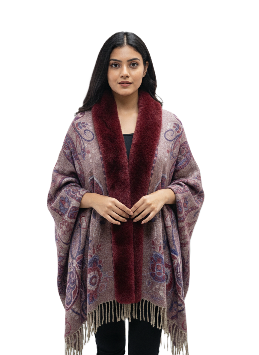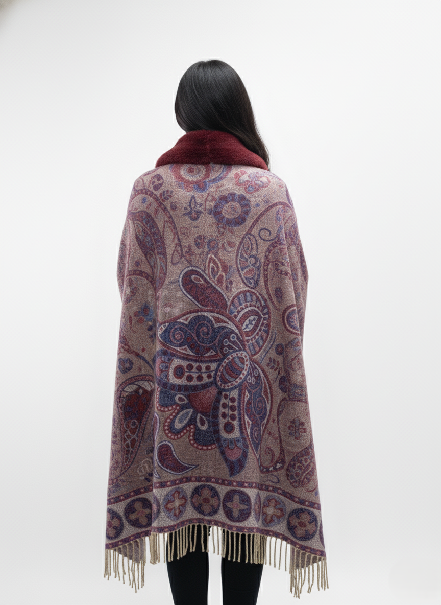 महिलाओं के लिए शानदार पैस्ले प्रिंटेड पोंचो केप, फॉक्स फर ट्रिम के साथ | गर्म बहुरंगी ऊनी मिश्रण आउटरवियर