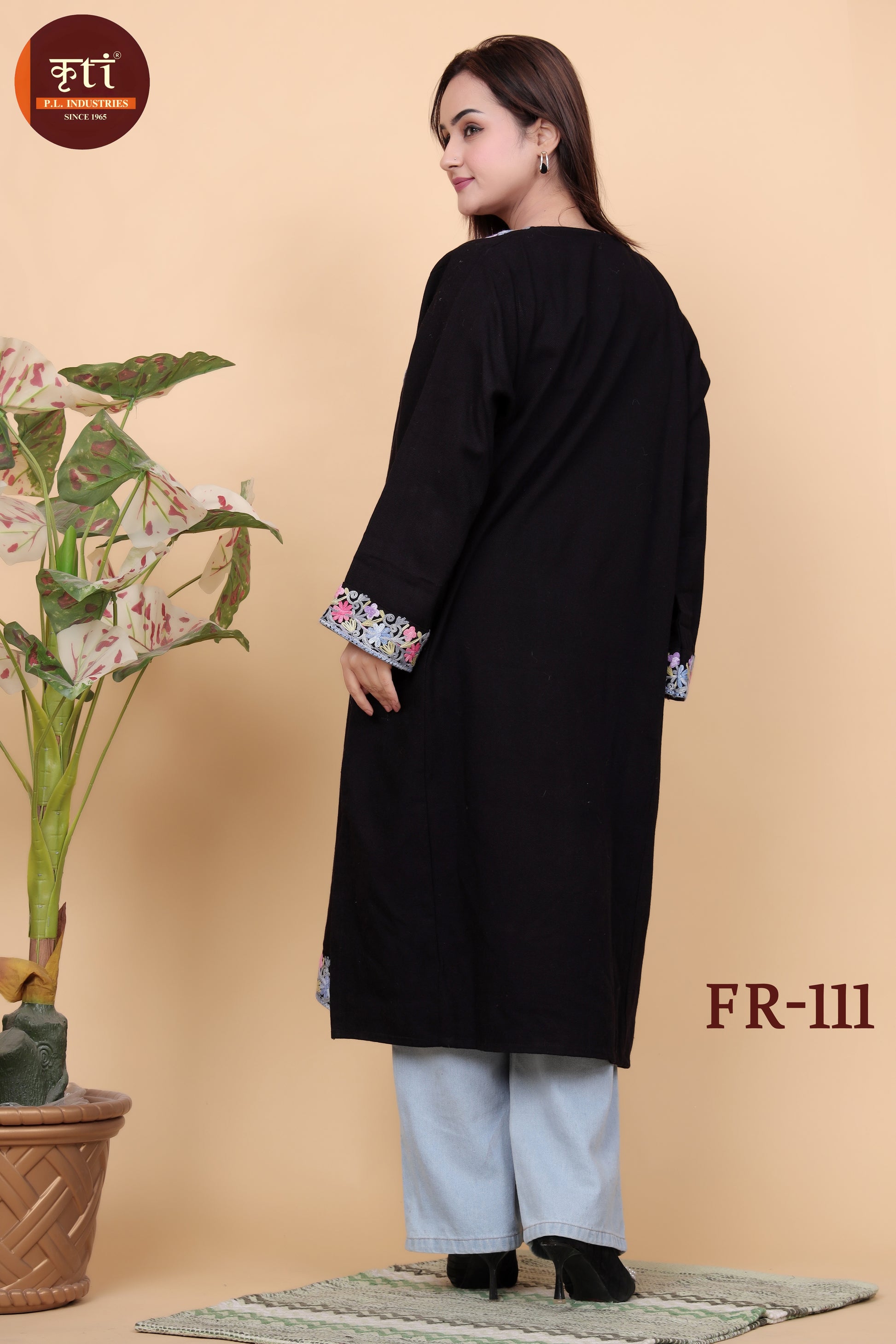 KRITI Kashmiri Floral Embroidery Woollen Phiran Black Color For Women