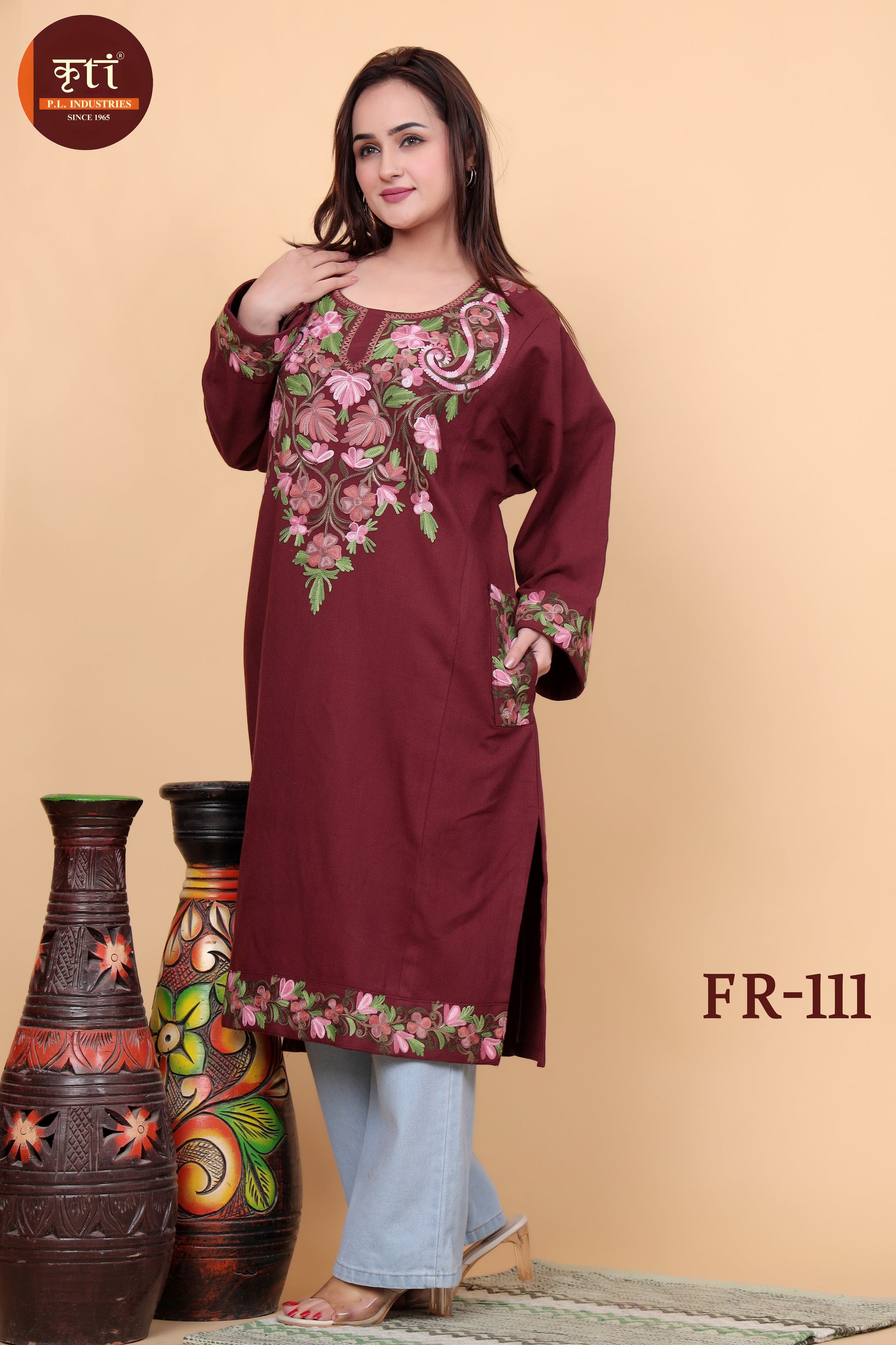 KRITI Floral Embroidery Woollen Phiran Maroon Color For Women