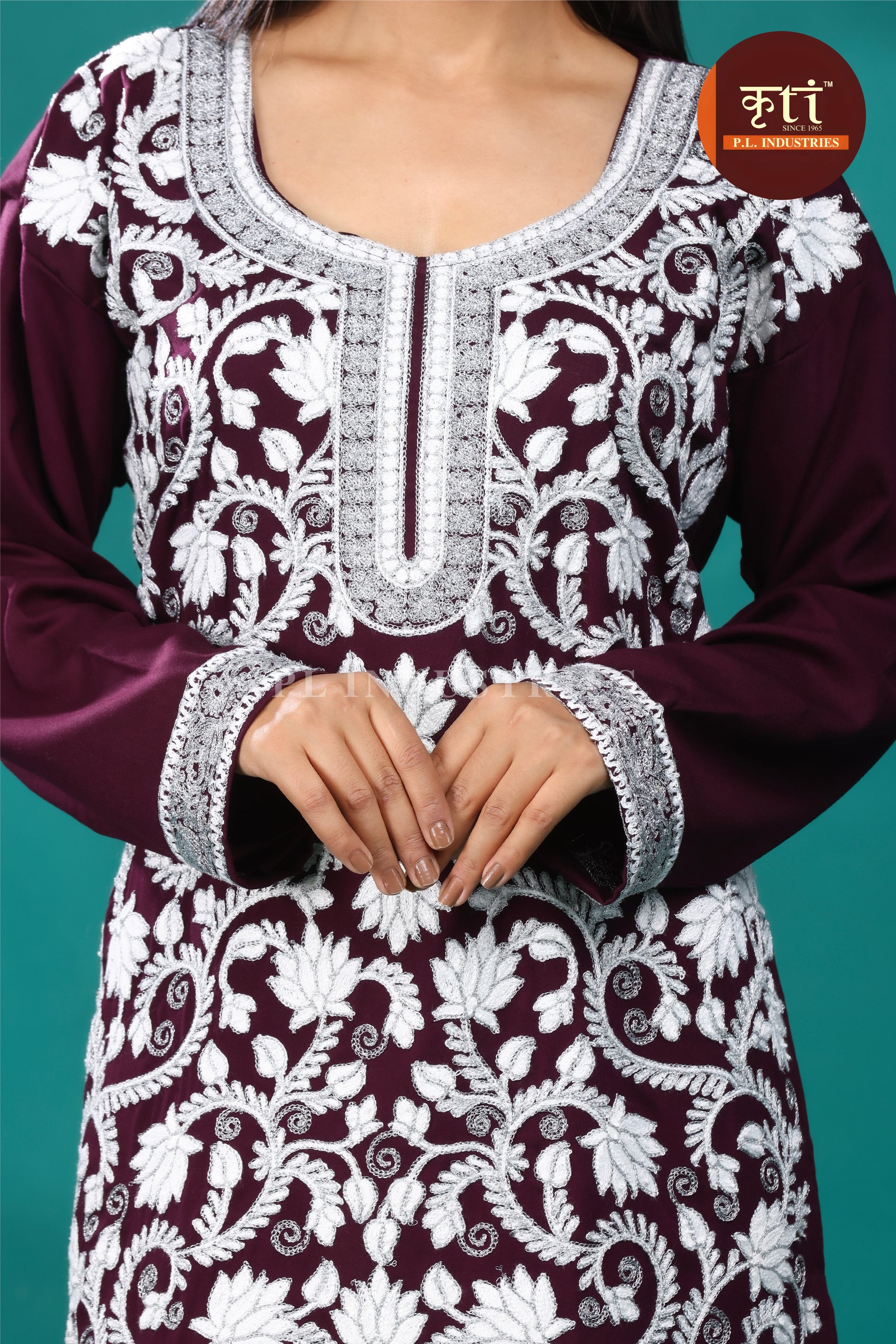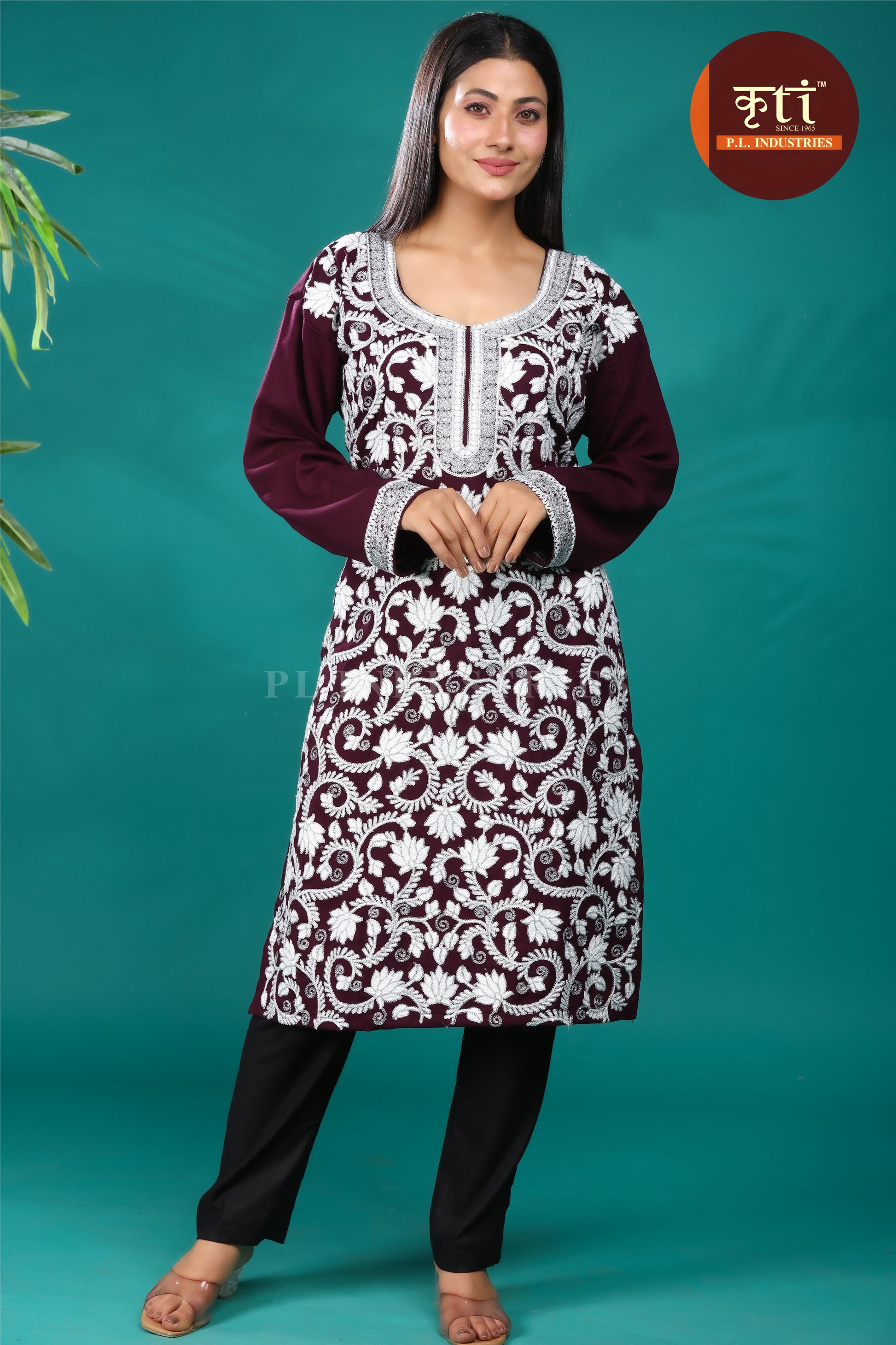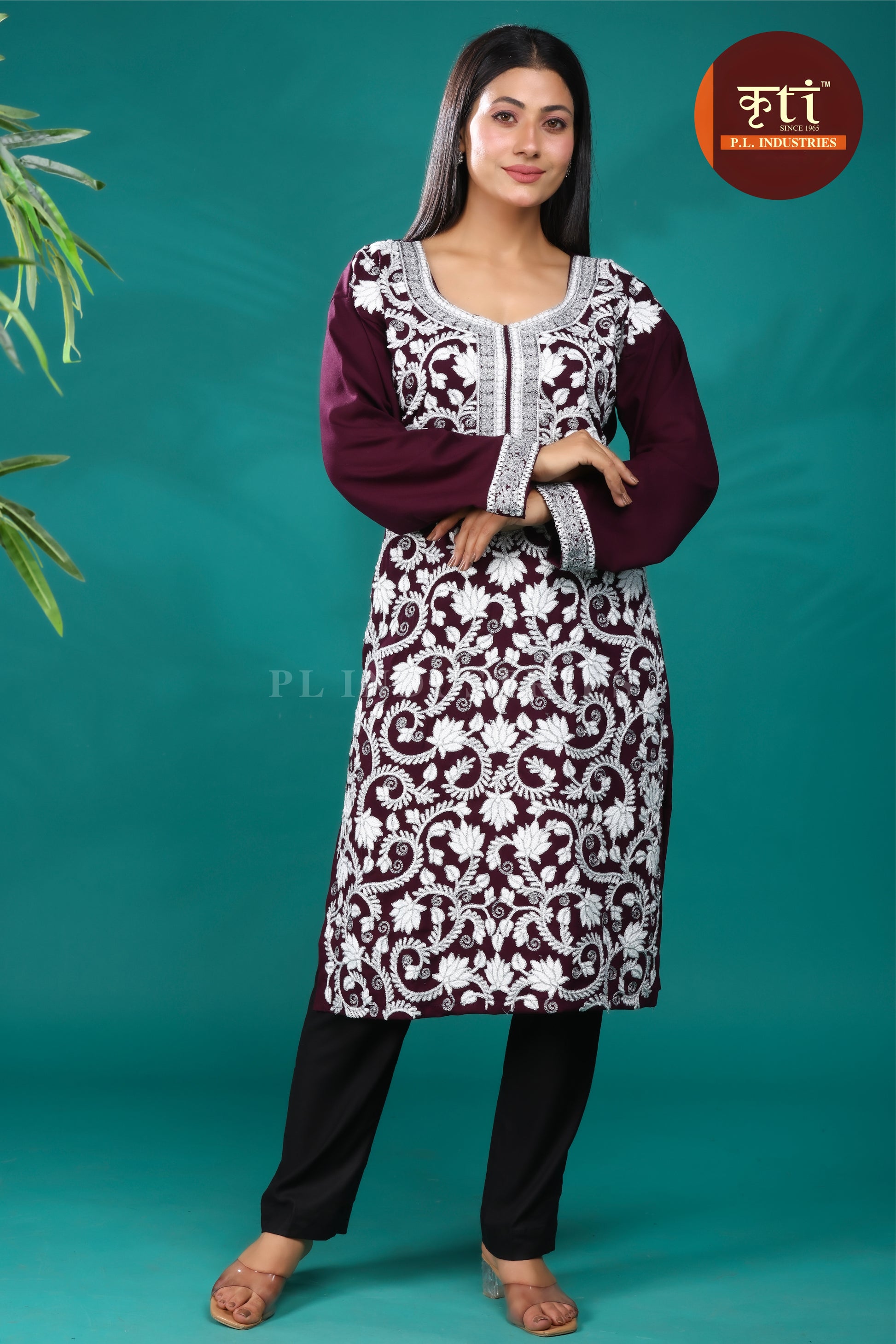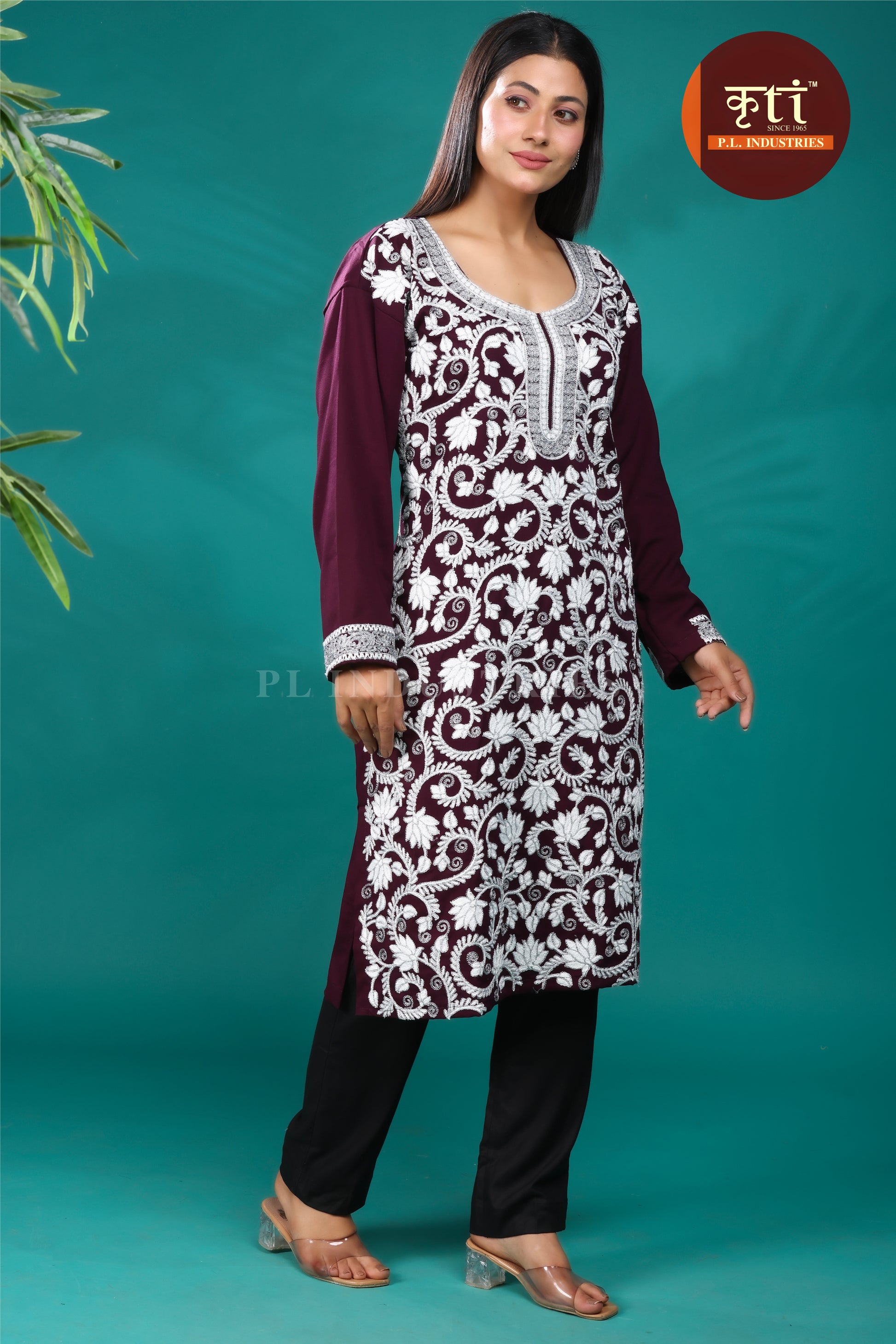 KRITI White Floral Embroidery Rayon Cotton Kurti Dark Maroon Color For Women