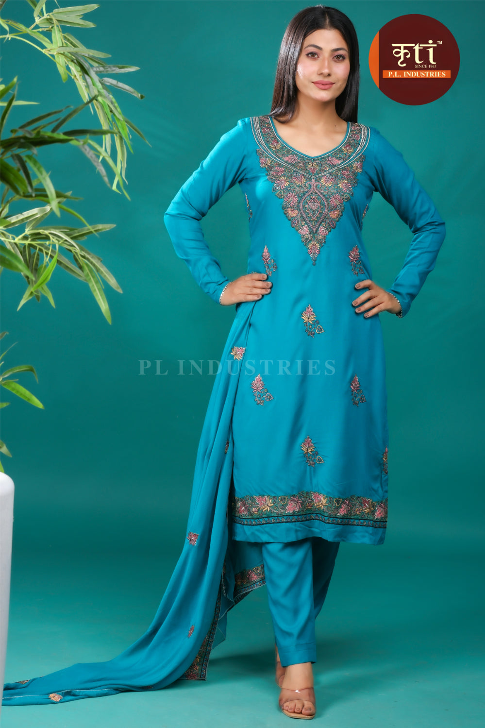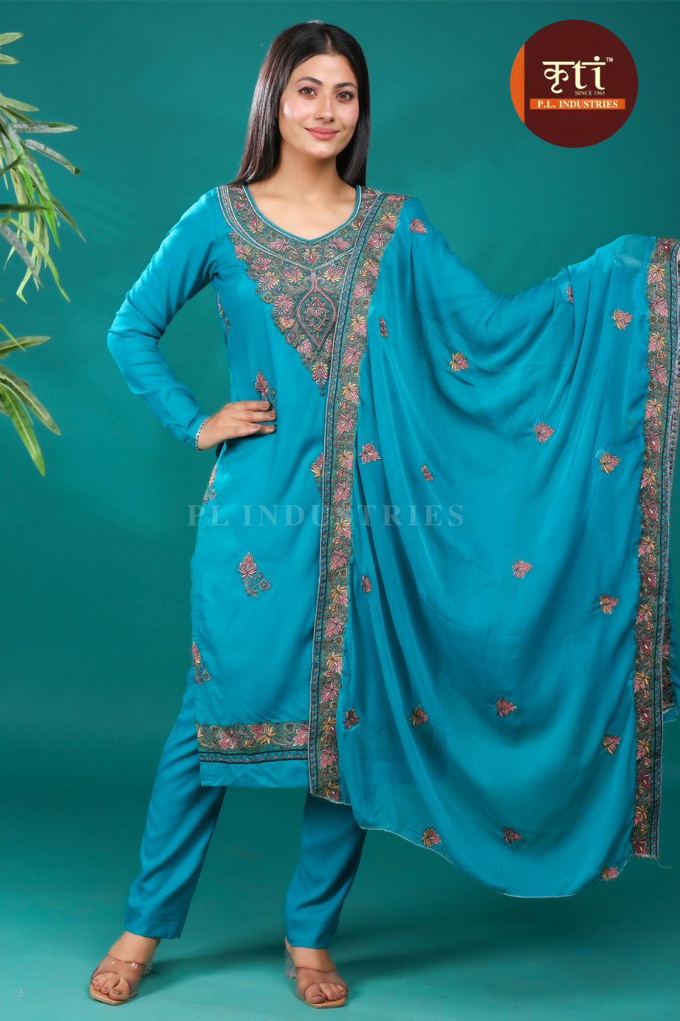 KRITI Unstitched Embroidery Work Cotton Suit With Dupatta Blue Color For Women