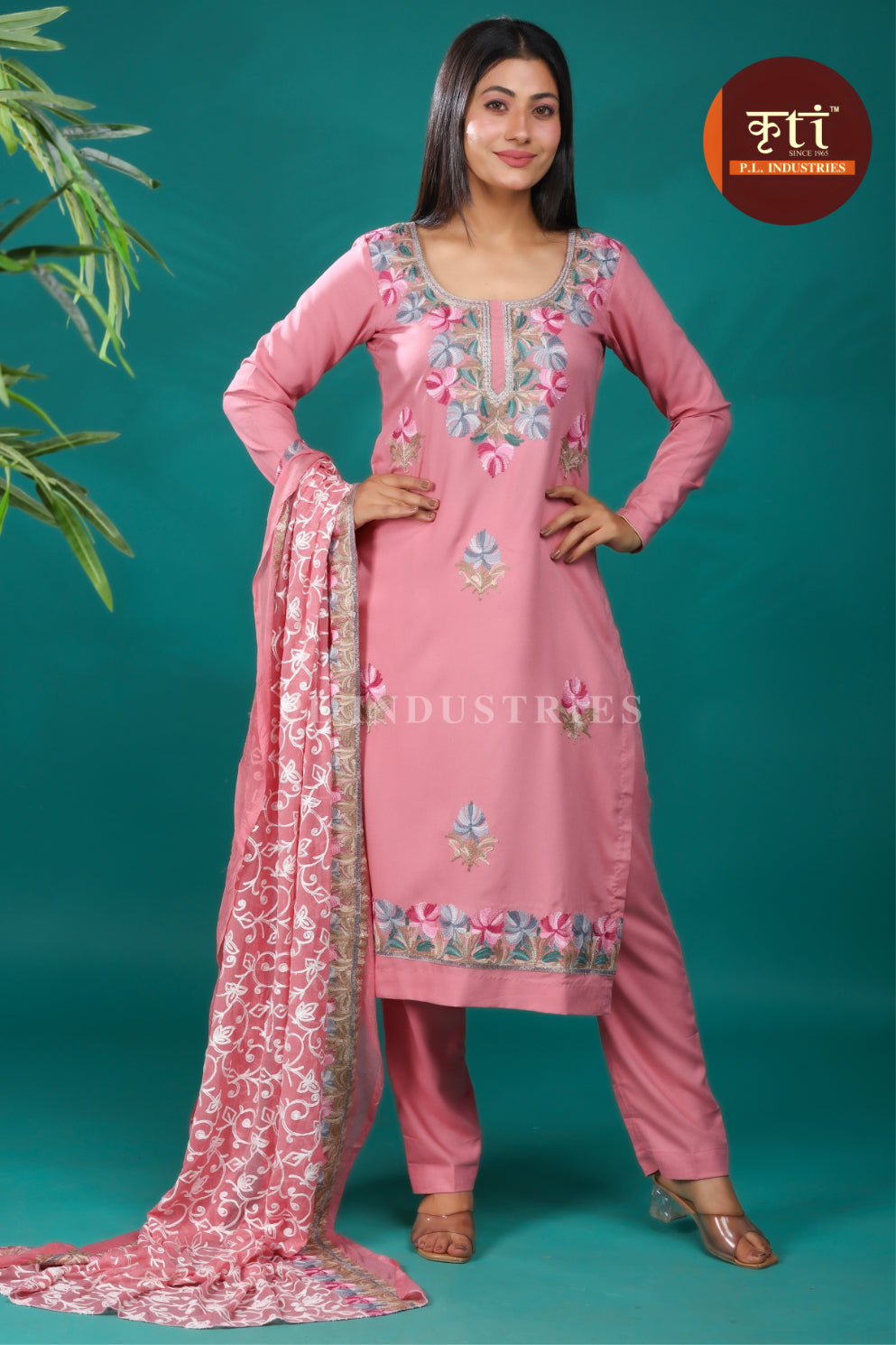 KRITI unstitched Floral Embroidery Rayon Cotton Suit With Dupatta Pink Color For Women