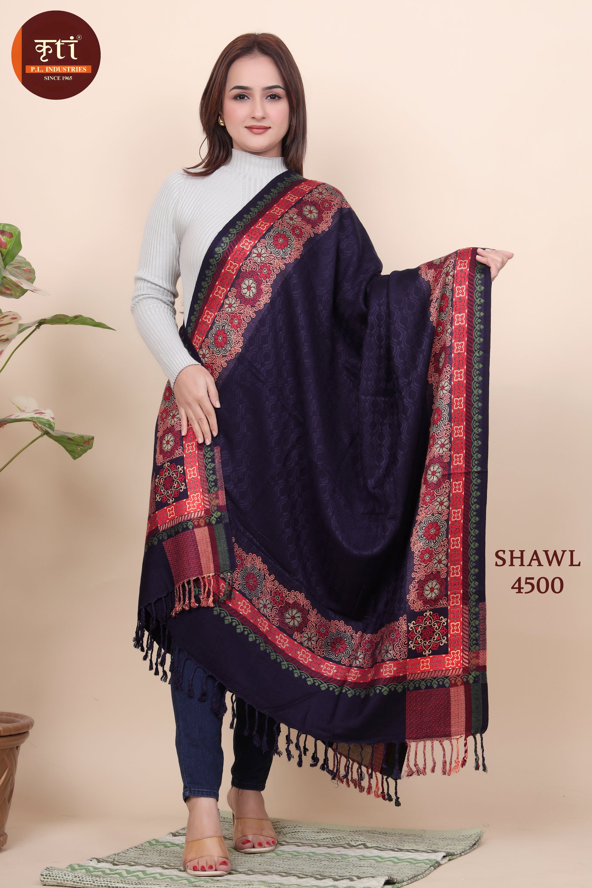 KRITI Traditional Border Woollen Navy Color Shawl For Women