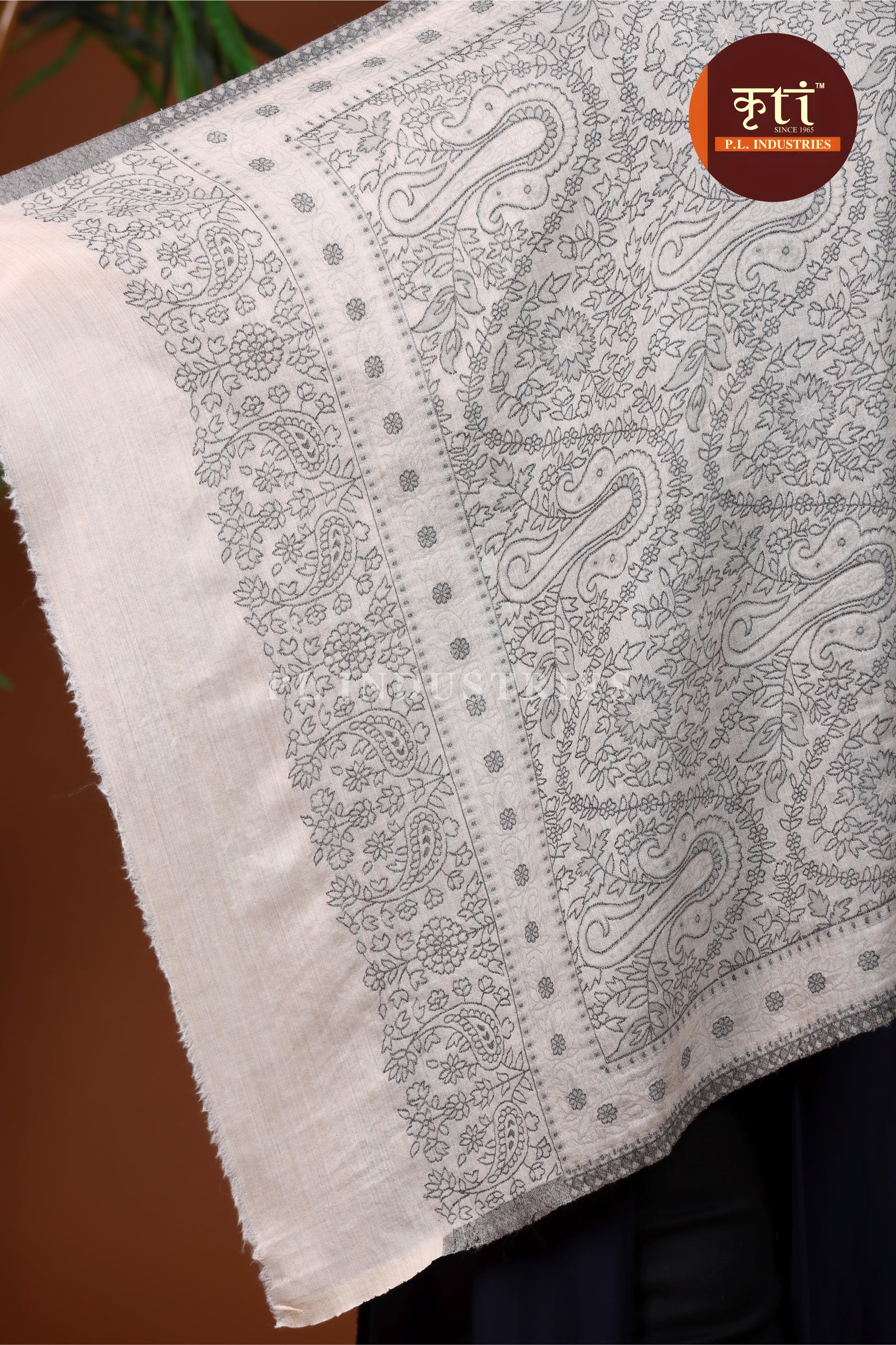 Drape yourself in timeless elegance with this fine wool stole, beautifully adorned with intricate paisley and floral motifs. Crafted from soft and lightweight wool, this stole offers warmth without compromising on comfort. Its delicate beige tone and classic design make it a versatile accessory—perfect for elevating both ethnic and contemporary outfits.