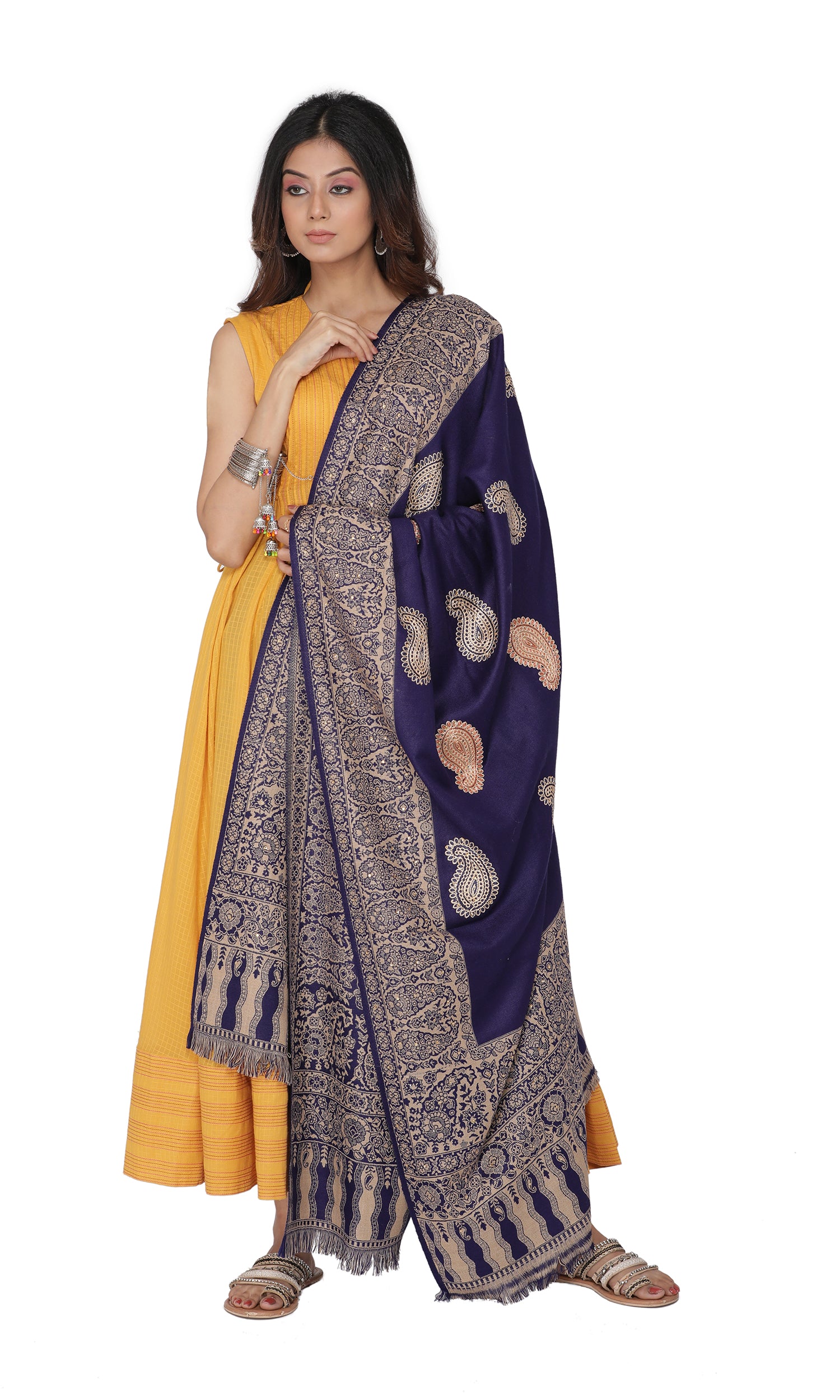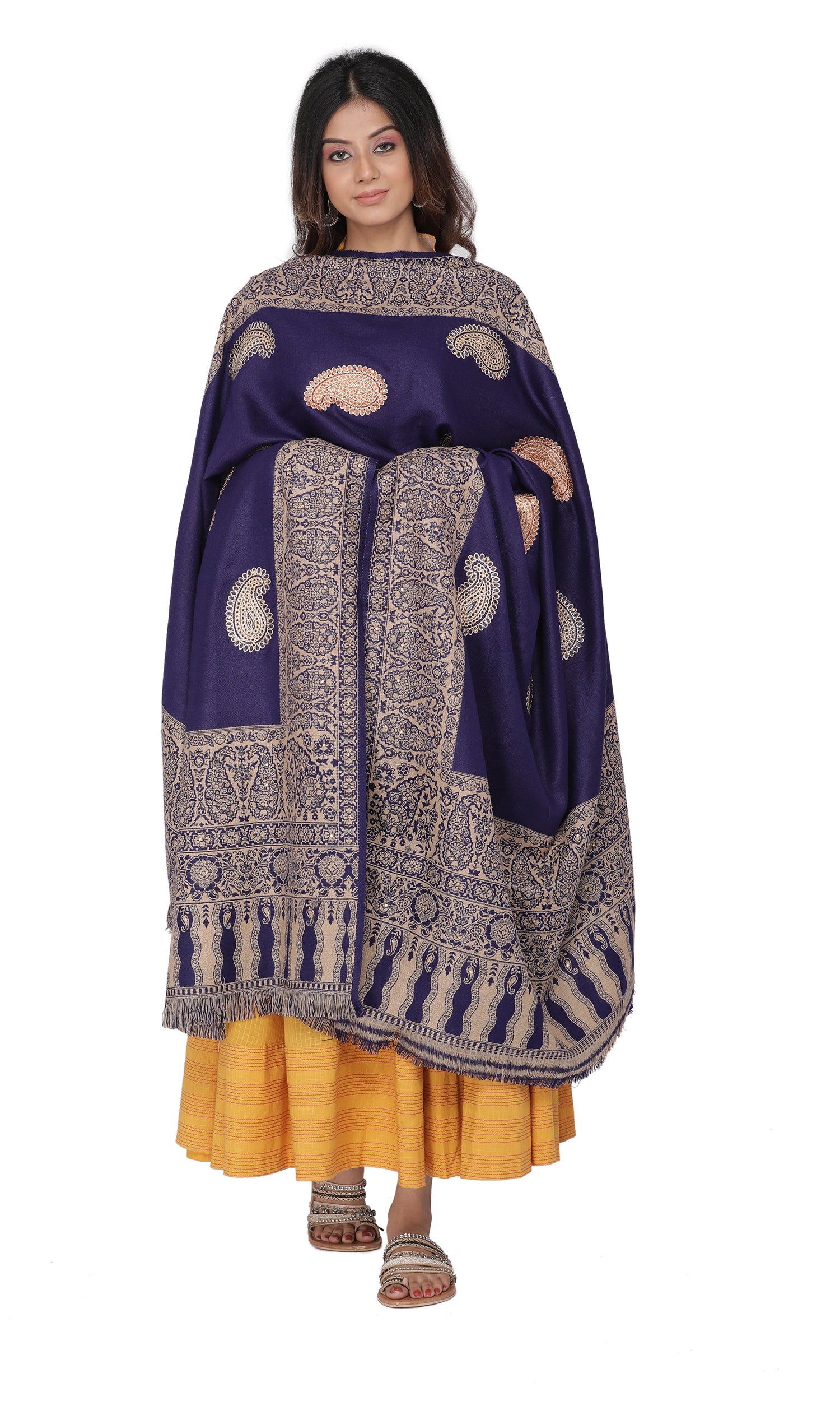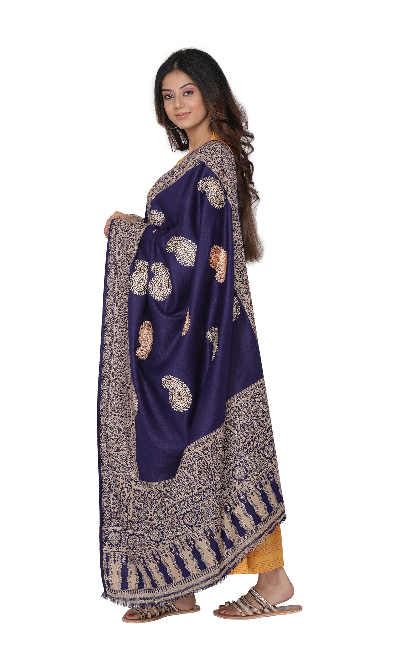 KRITI Paisley Border Design Woolen Navy Color Shawl For Women