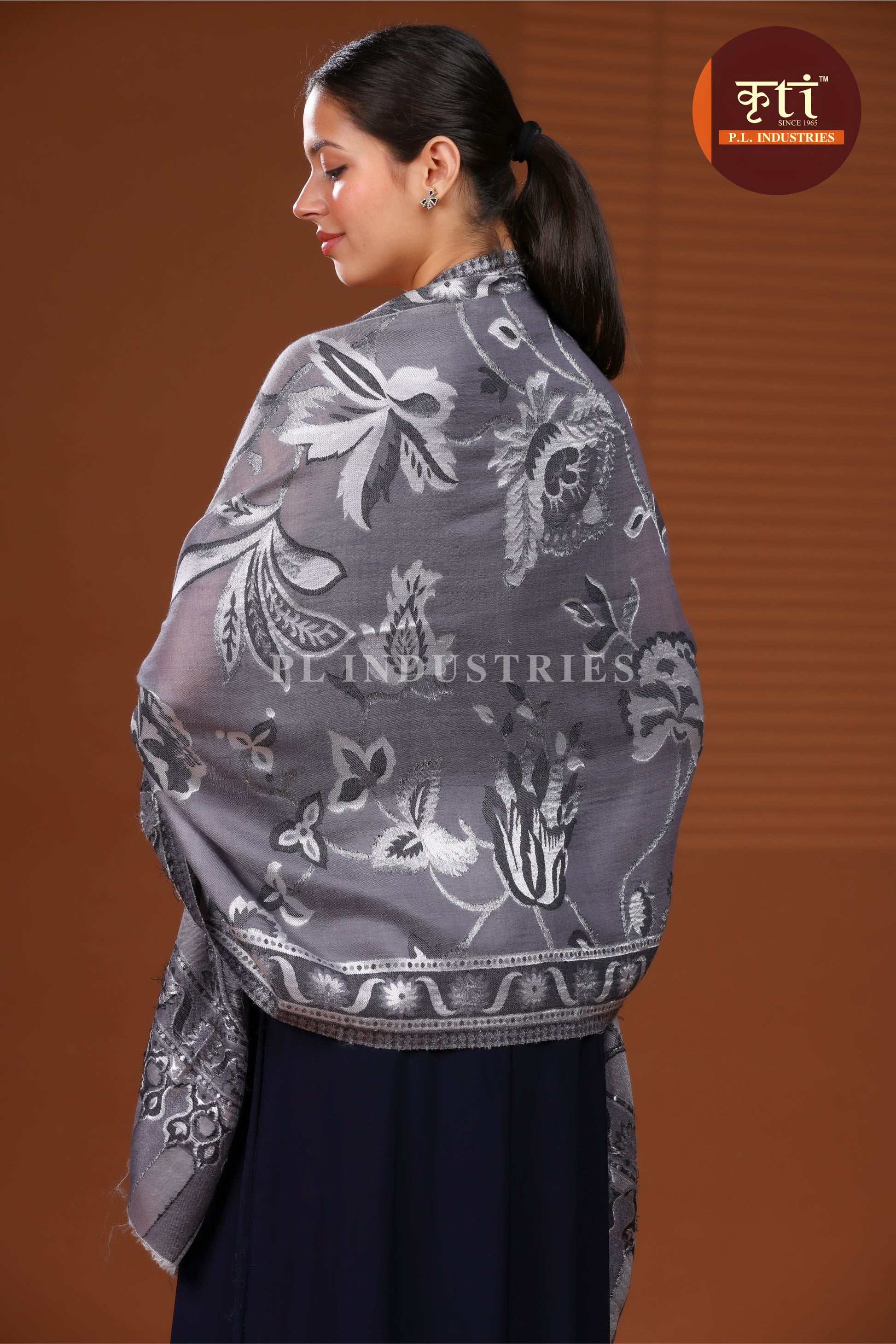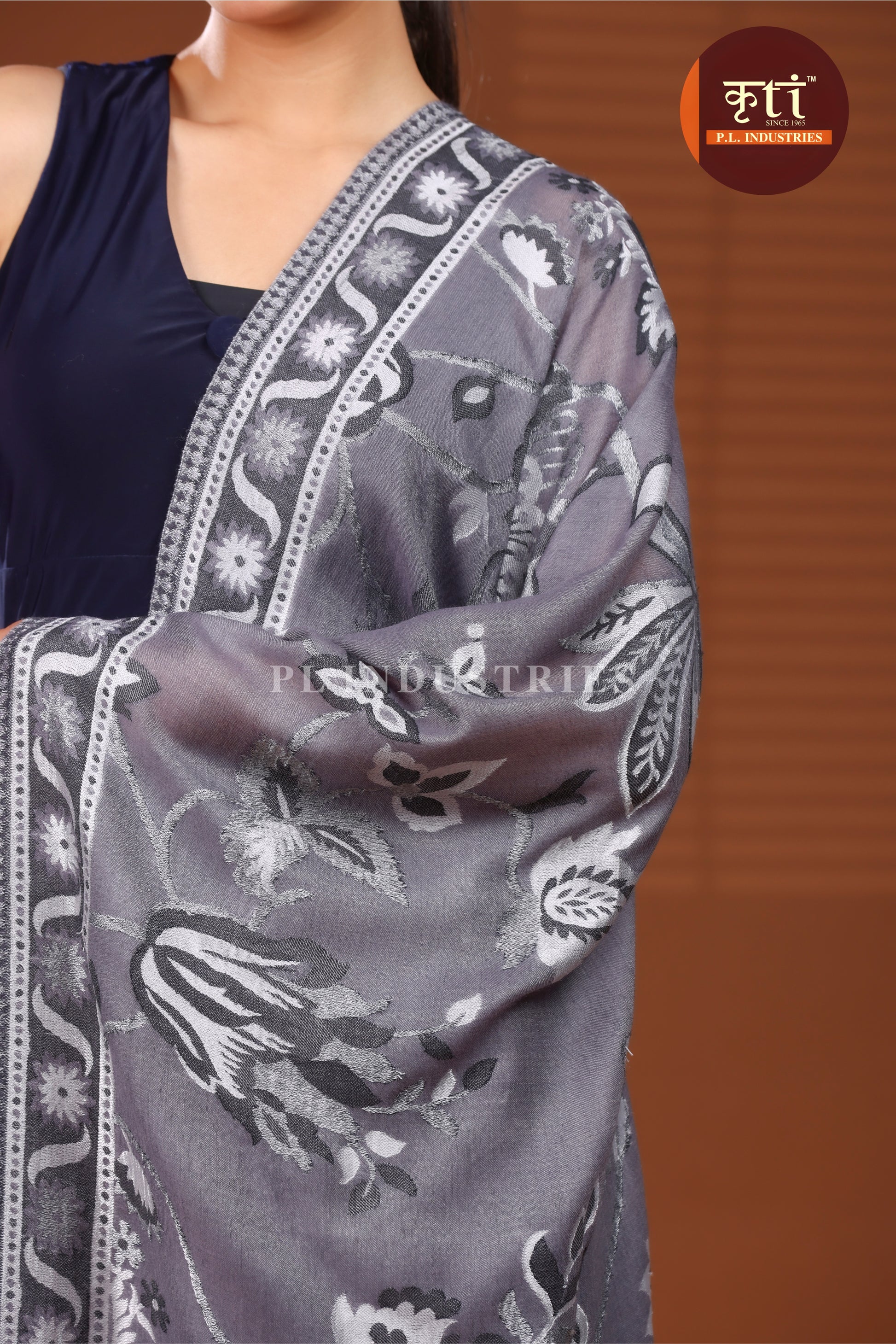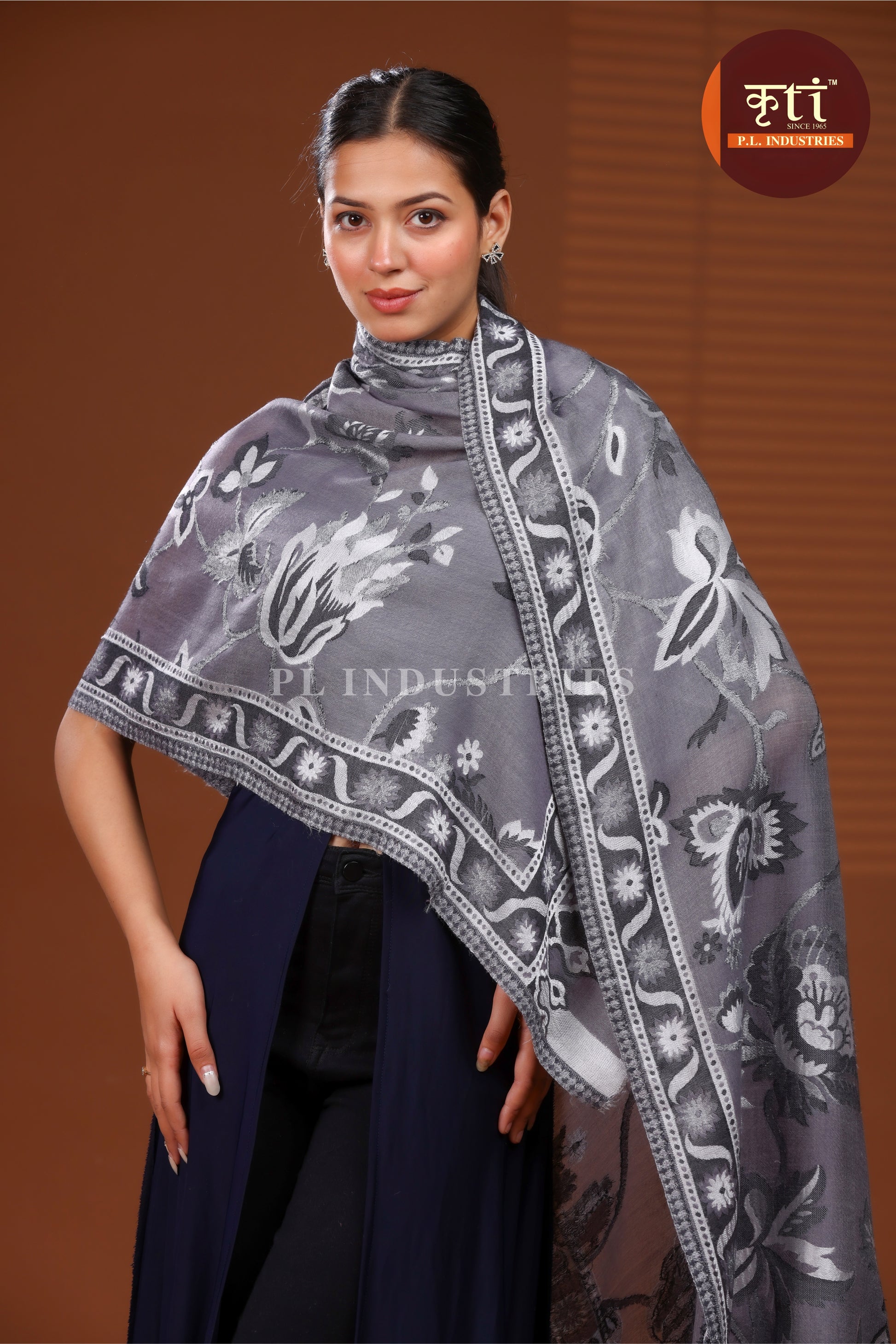 KRITI Luxury Floral Pattern Fine Wool Grey Color Stole For Girl
