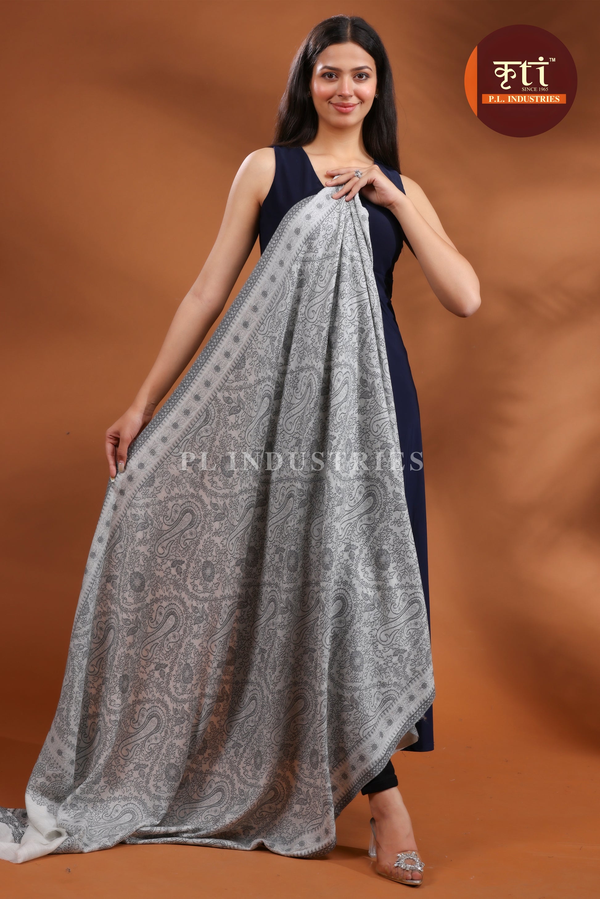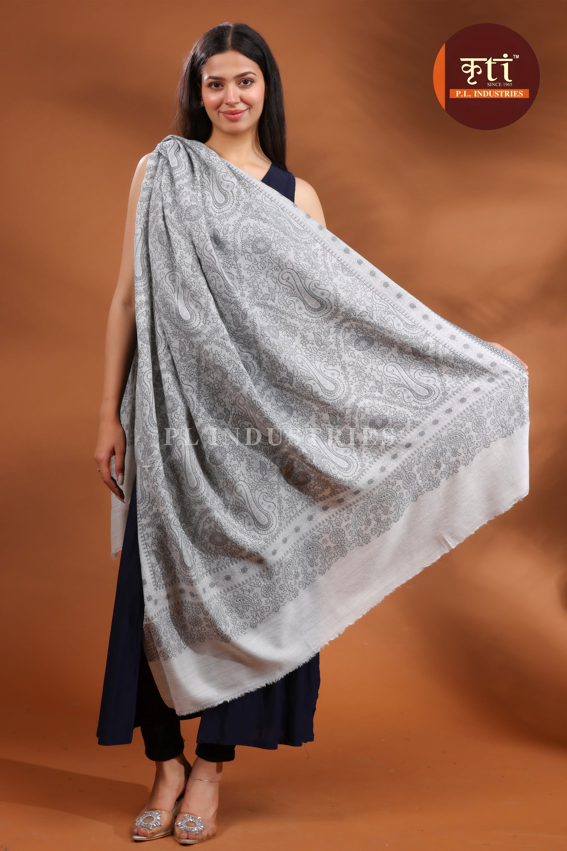 KRITI Premium Paisley Floral Design Fine Wool Grey Shawl for Women