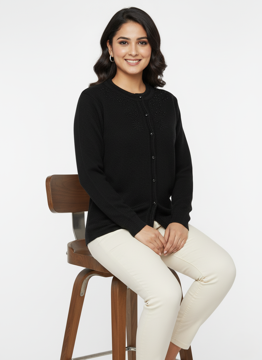 Stay cozy and effortlessly stylish with the Kriti Rainbow Embroidery Cardigan, a perfect fusion of comfort and grace. Crafted from soft wool-blend fabric, this full-sleeve black cardigan features delicate tone-on-tone embroidery around the neckline, giving it a subtle yet premium appeal. Ideal for work, outings, and festive evenings, this cardigan keeps you warm while elevating your winter style.