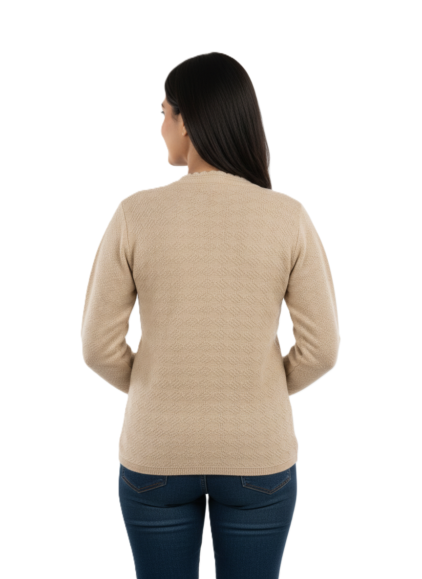 Add a graceful charm to your winter wardrobe with the Kriti Rainbow Embroidery Cardigan. Designed with soft wool-blend fabric, this full-sleeve beige cardigan offers cozy warmth and timeless sophistication. The delicate floral embroidery on the neckline enhances its feminine appeal, while the matching buttons add to its seamless, elegant look. Perfect for both everyday wear and festive gatherings, this cardigan blends comfort, class, and warmth effortlessly.