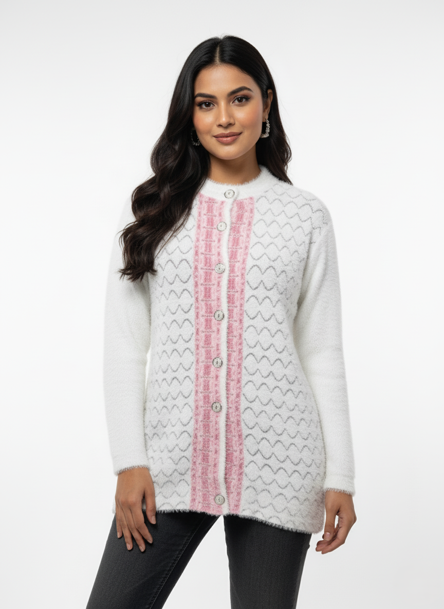 Stay cozy and classy this season with the Kriti Winter Stylish Hair Cardigan for Women. Made from a soft and premium wool-blend fabric, this elegant white cardigan features a delicate pink and grey front pattern, offering a chic and feminine touch. Perfect for layering, it combines warmth with sophisticated winter fashion.
