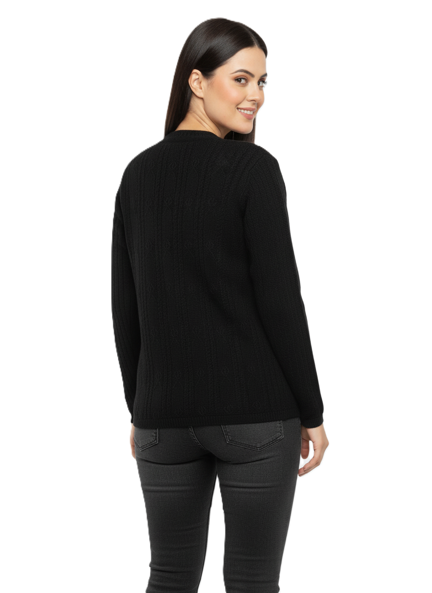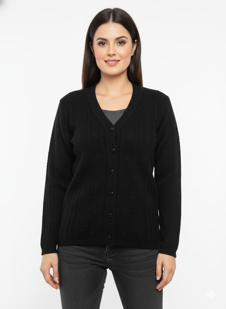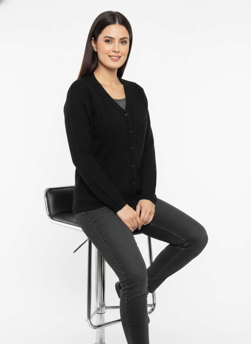 Embrace timeless elegance with the Kriti Rainbow Knitted Cardigan in classic black. Designed for warmth and style, this cardigan is crafted from a premium soft wool-blend fabric that offers a cozy yet breathable feel. Its fine knit detailing, button-down closure, and comfortable fit make it the perfect winter essential for everyday wear or layering on chilly evenings.