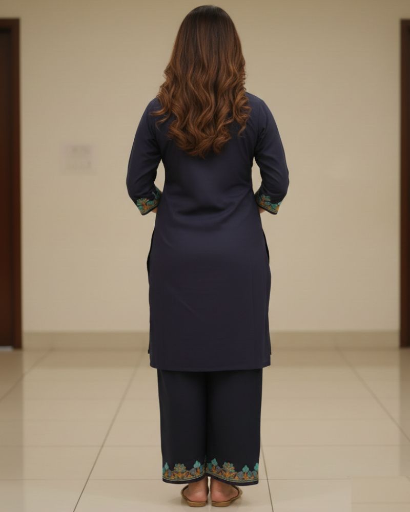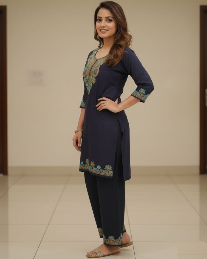 Elevate your everyday ethnic style with this elegant Rayon Co-ord Set designed for comfort and sophistication. Crafted from soft and breathable rayon fabric, this beautiful set features intricate embroidery on the neckline and sleeves, adding a touch of traditional charm. The straight-fit kurta paired with matching wide-leg pants creates a graceful silhouette perfect for casual outings, office wear, or festive gatherings. Lightweight and comfortable, this co-ord set ensures effortless style all day long.