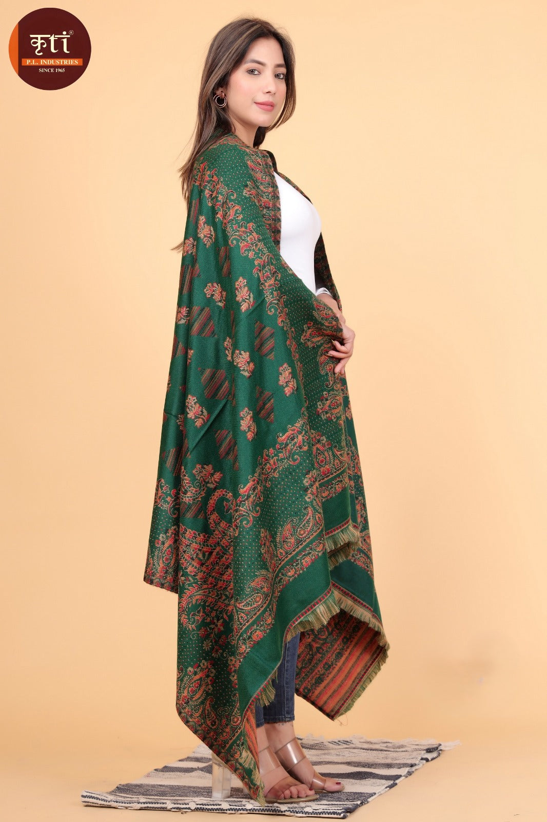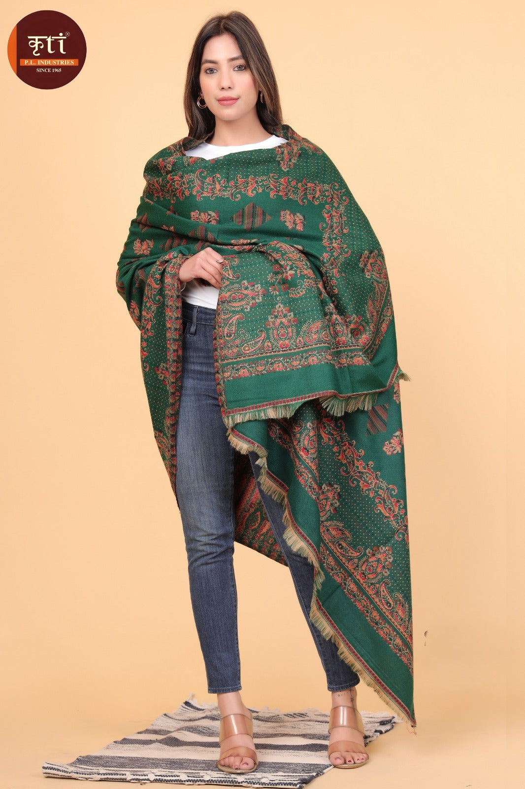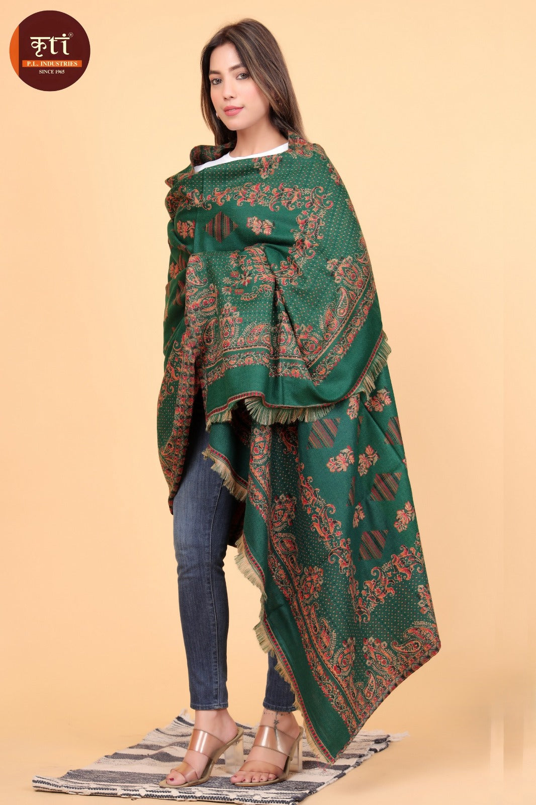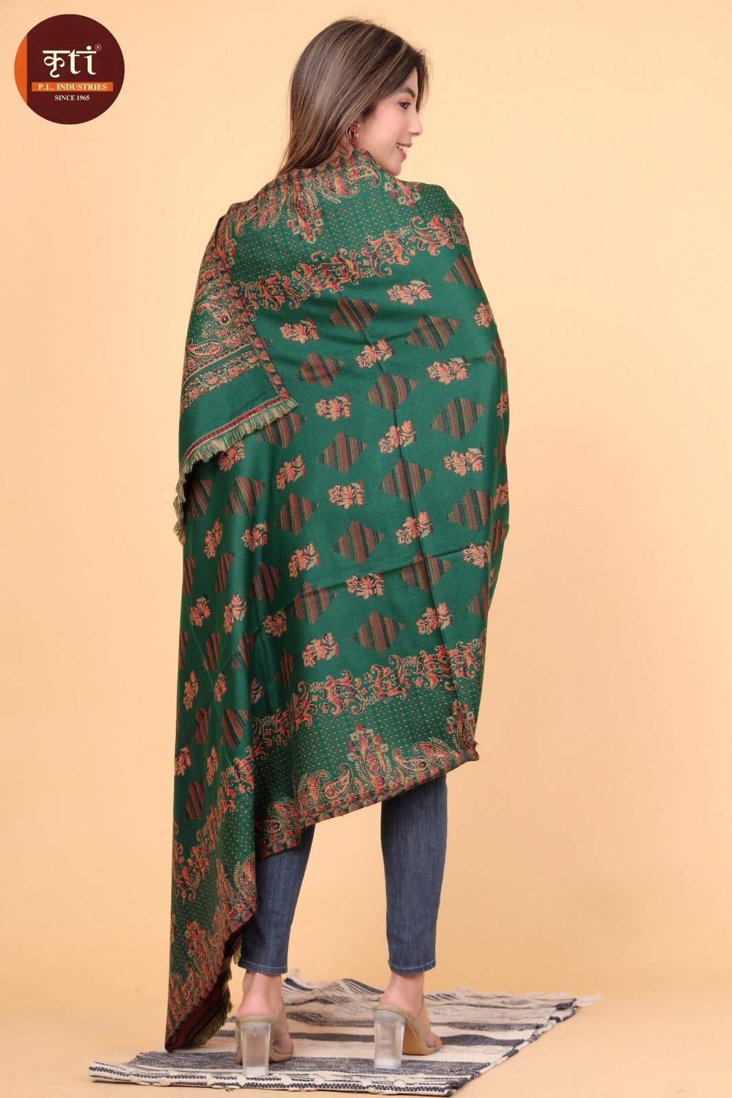 KRITI Luxury Floral Border Woollen Green Color Shawl For Women