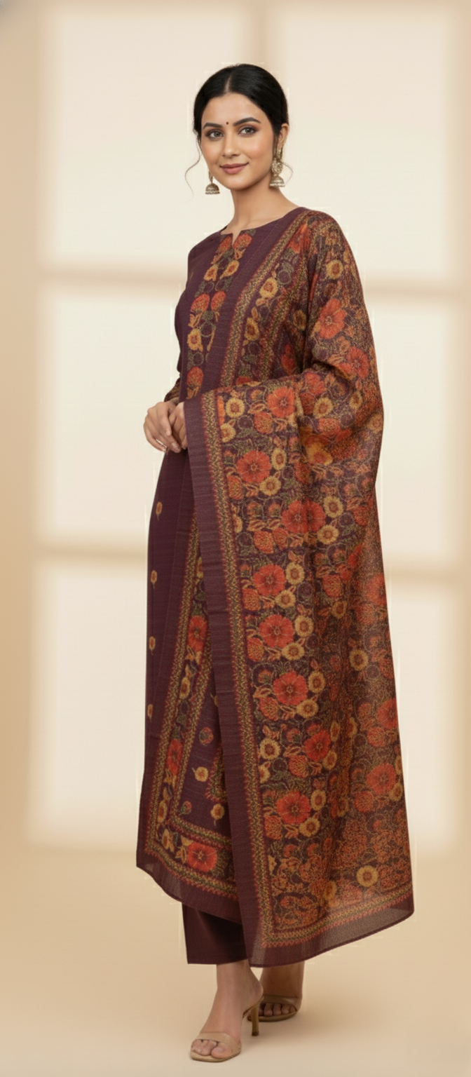 ● Dupatta: Matching printed wool dupatta with rich floral design