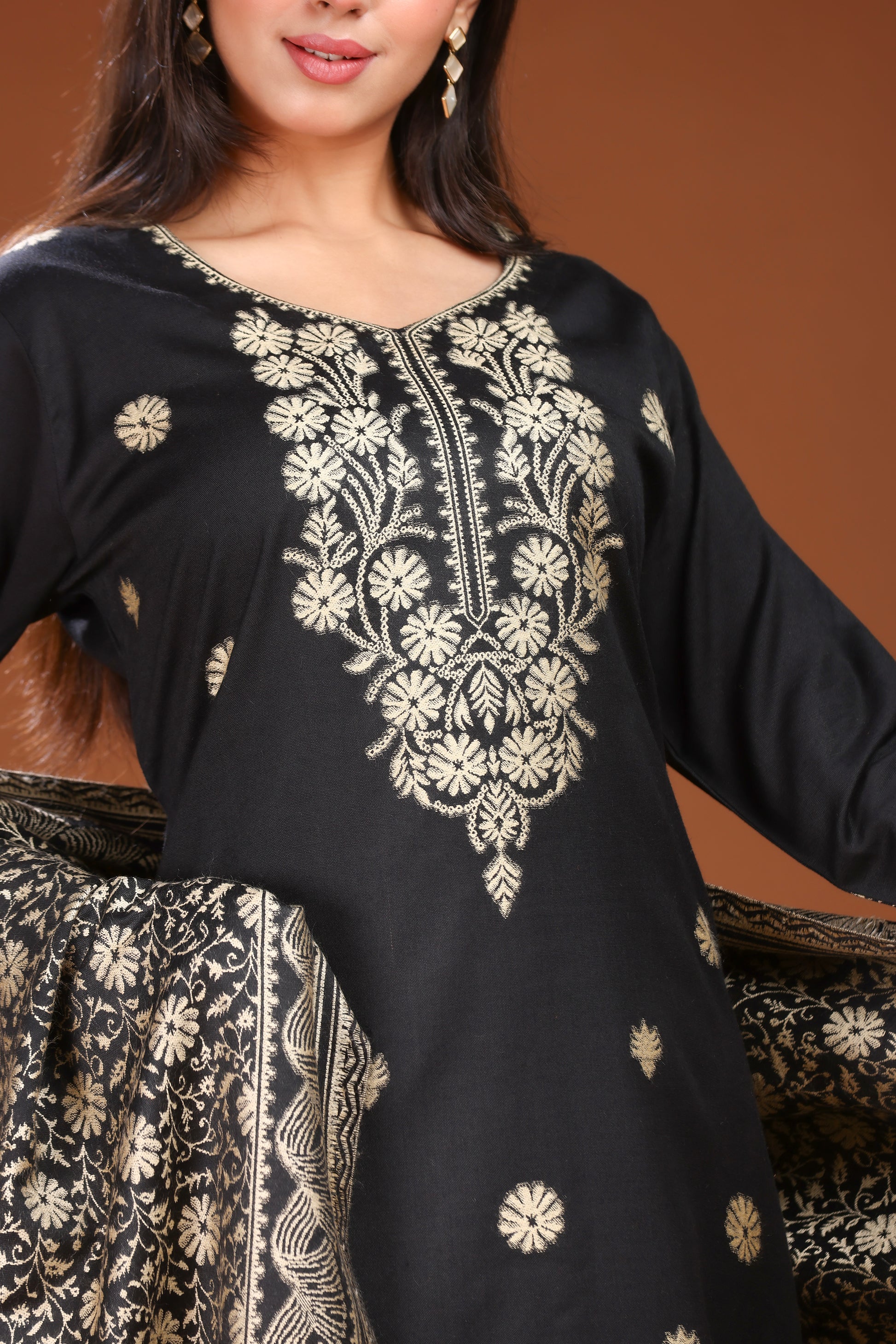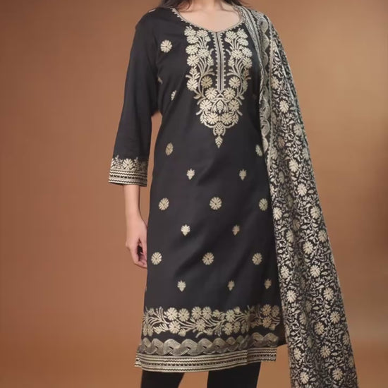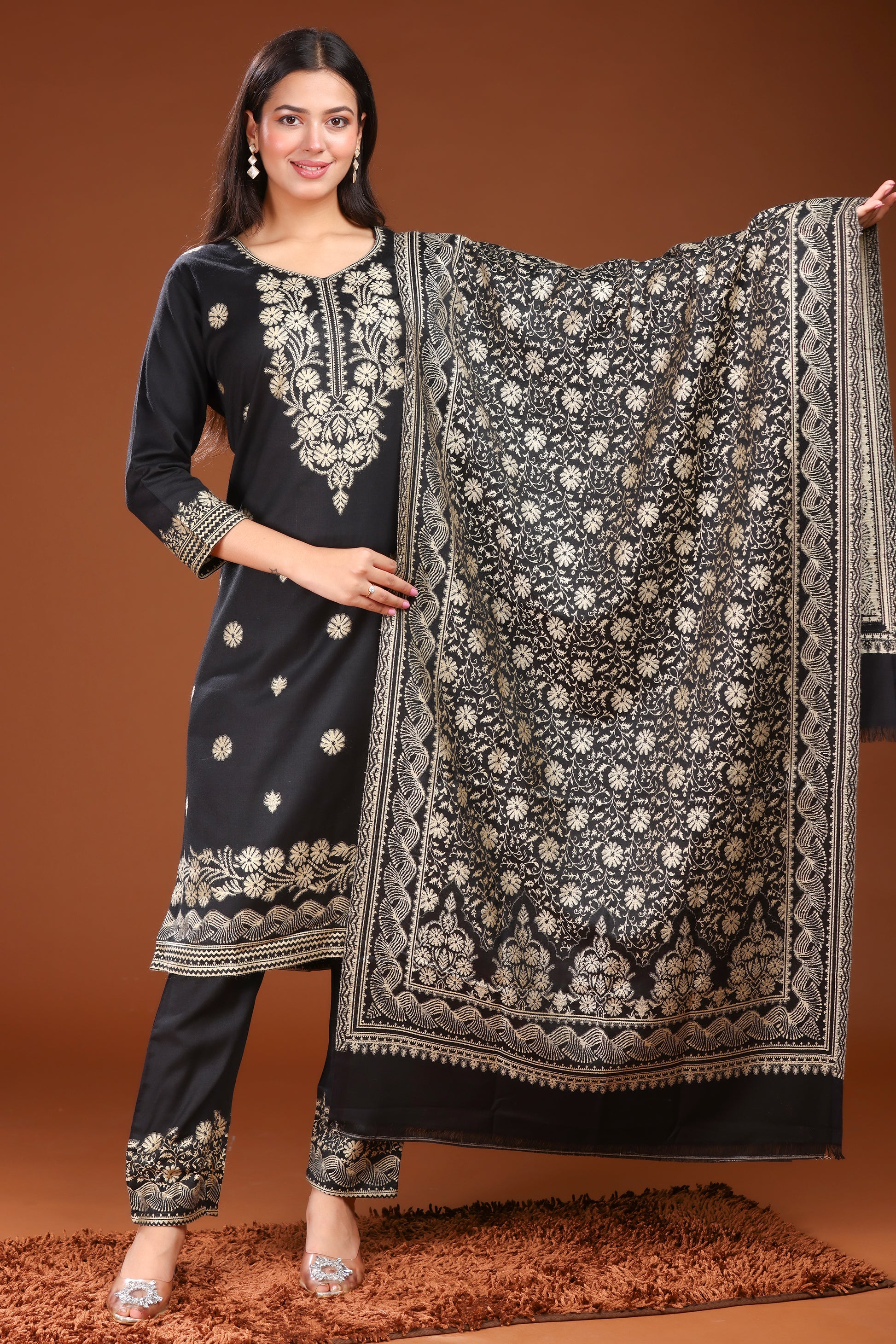 Embrace the winter season in style with this exquisite woolen unstitched suit set. Crafted from high-quality, soft wool, this ensemble promises both warmth and elegance. The set features a black kurta and trousers, beautifully adorned with intricate beige and gold woven in a traditional floral and paisley pattern. The rich, detailed work on the neckline, sleeves, and hem adds a touch of sophistication, making it perfect for festive occasions and winter gatherings. The highlight of the set is the matching shawl, which showcases a dense, all-over weaving design with a stunningly detailed border, providing a luxurious drape and an extra layer of warmth. Customize this unstitched fabric to your perfect fit and style, and create a unique outfit that reflects your personal taste while keeping you cozy all season long.