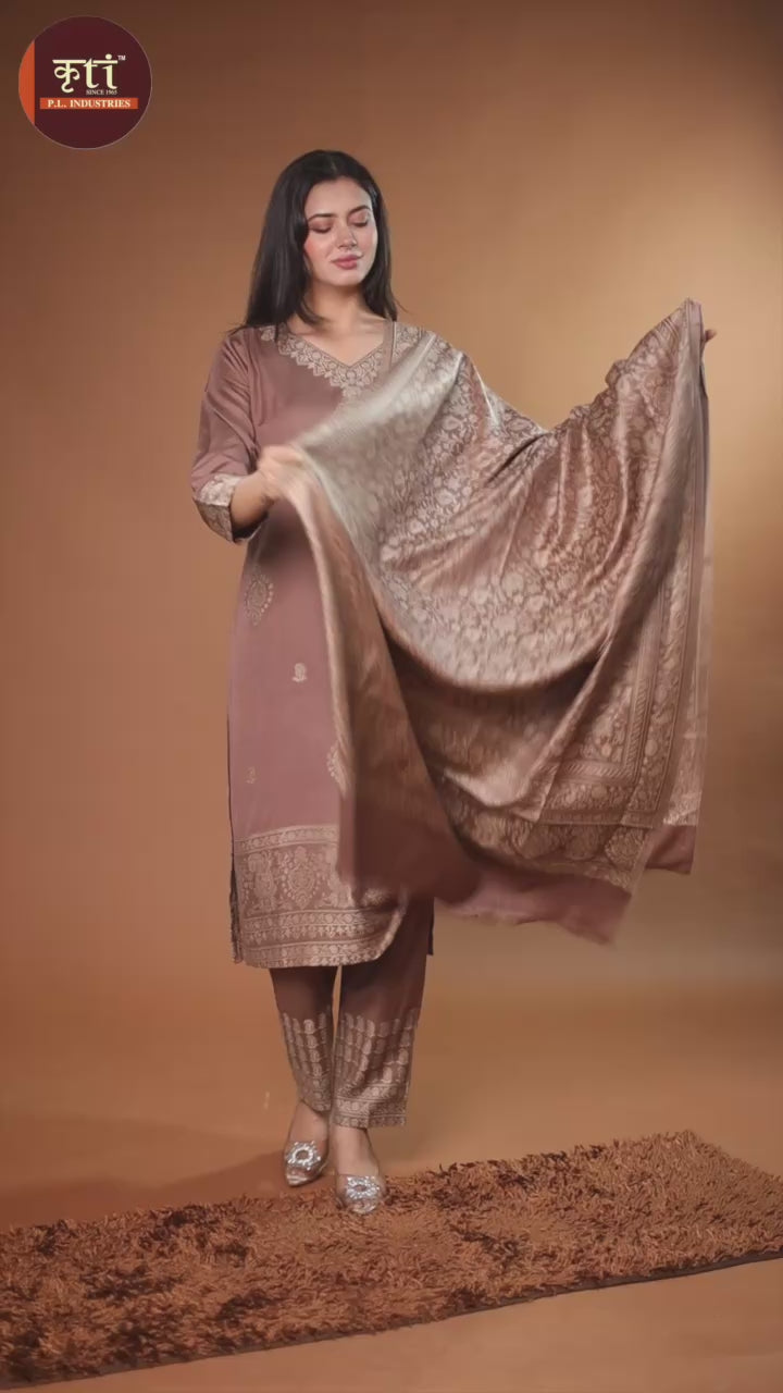 KRITI Woolen Unstitched Winter Suit Set Weave Design Coffee Color For Women