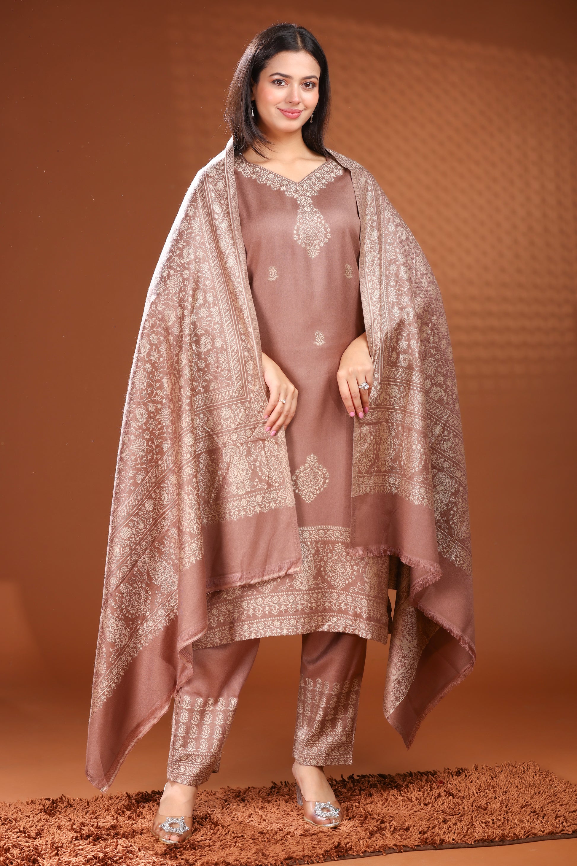 Embrace the winter season in style and warmth with this exquisite woolen suit set. The rich, earthy tone of the fabric is beautifully complemented by intricate embroidery in a contrasting gold thread, creating a look that is both traditional and sophisticated. The suit features delicate around the V-neckline and scattered motifs on the kurta, adding a touch of elegance. The matching dupatta, draped gracefully, is adorned with a detailed border and traditional patterns, ensuring you stay cozy without compromising on style. Perfect for festive occasions, formal gatherings, or a stylish everyday look during the colder months.