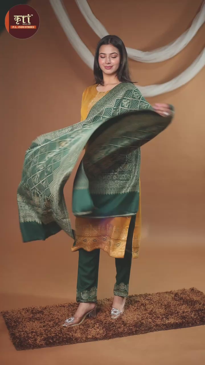 Embrace the winter season in style and warmth with this exquisite woolen suit set. The rich, earthy tone of the fabric is beautifully complemented by intricate woven patterns in a contrasting gold thread, creating a look that is both traditional and sophisticated. The suit features delicate weaving around the V-neckline and scattered motifs on the kurta, adding a touch of elegance. The matching shawl, draped gracefully, is adorned with a detailed border and traditional patterns, ensuring you stay cozy without compromising on style. Perfect for festive occasions, formal gatherings, or a stylish everyday look during the colder months.