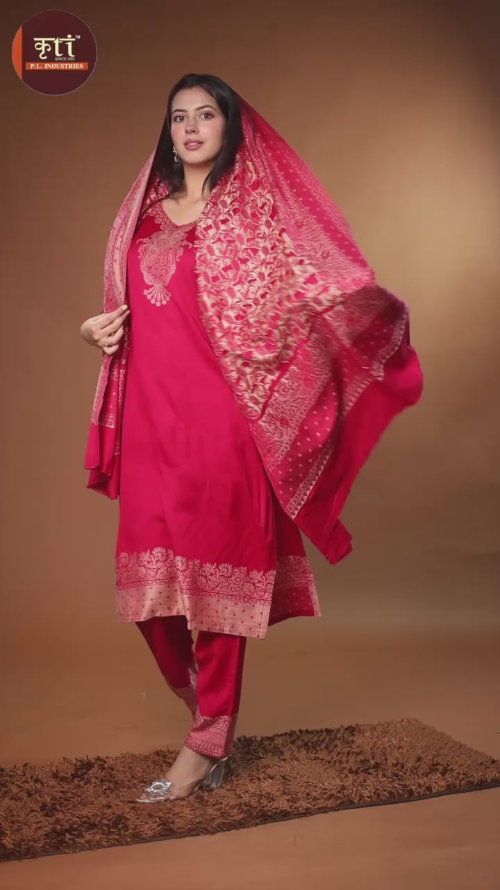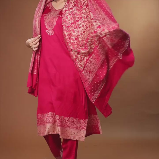 Make a bold statement this winter with this stunning fuchsia woolen suit set. The vibrant pink hue is beautifully contrasted with intricate golden woven patterns, creating a rich and opulent look. The kurta features a detailed woven design around the neckline, adding a touch of traditional elegance. The matching pants also have a tasteful golden woven border at the hem, tying the look together seamlessly. The highlight of this ensemble is the luxurious fuchsia shawl, which is generously adorned with all-over golden woven motifs and a striking border, ensuring you stay warm, comfortable, and undeniably stylish throughout the colder months. Perfect for special occasions and celebrations.