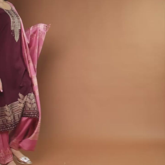 Stay warm and stylish this winter with this elegant woolen suit. The deep maroon kurta is beautifully embroidered with intricate gold patterns, adding a touch of sophistication. Paired with a soft, dusty pink dupatta that features a detailed gold weave, this ensemble creates a striking and luxurious look. The high-quality wool fabric ensures exceptional warmth and a comfortable feel, making it the perfect choice for any occasion, from a festive celebration to a cozy evening out.