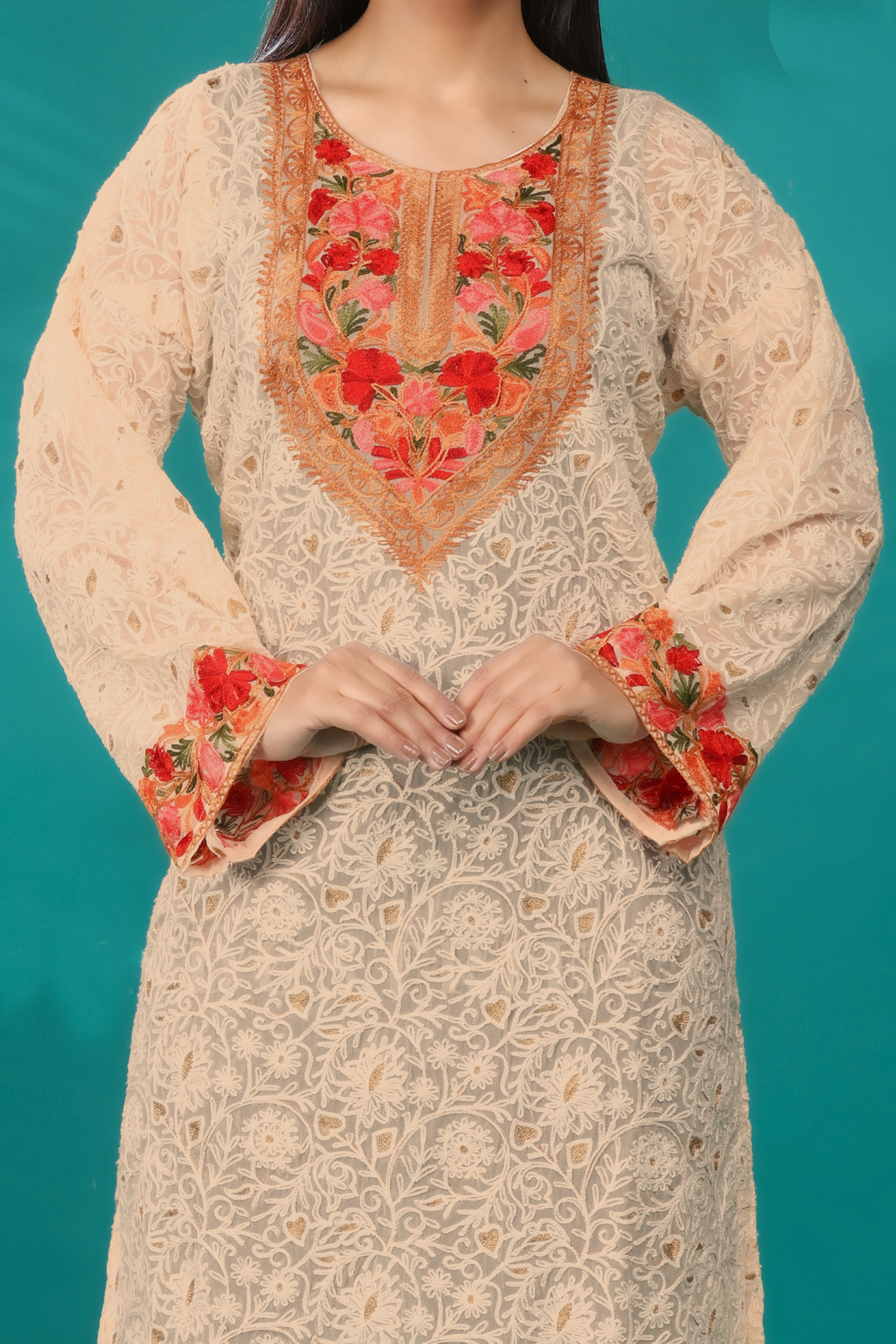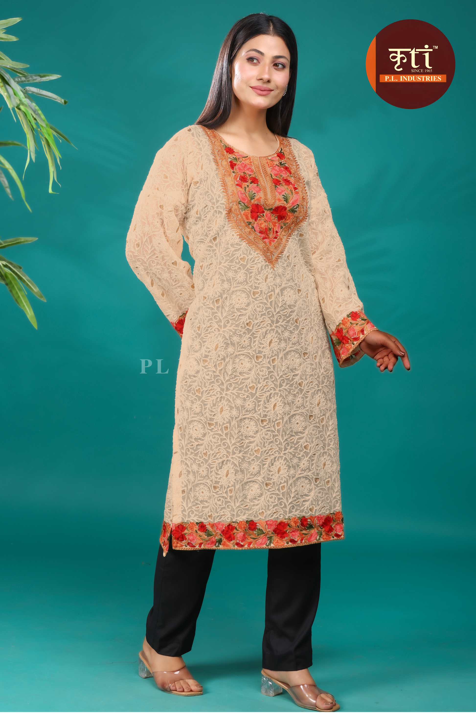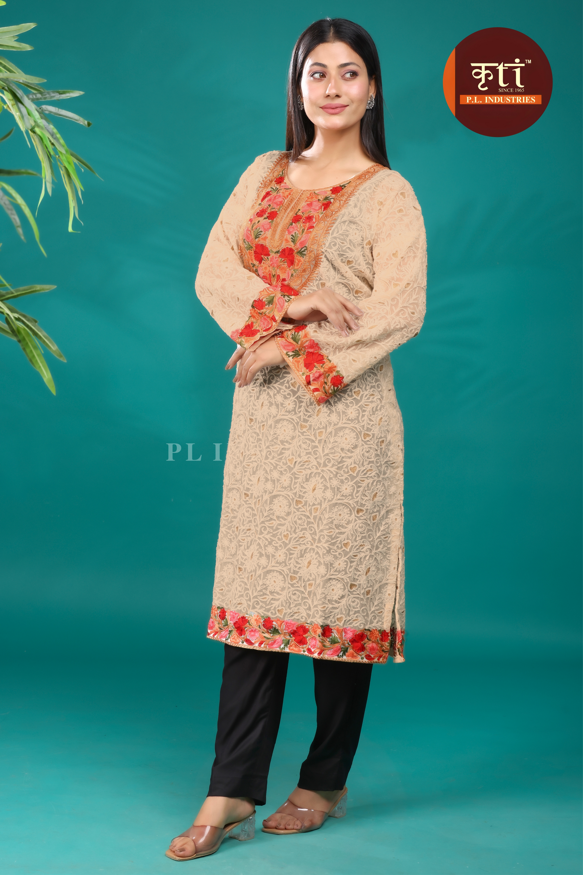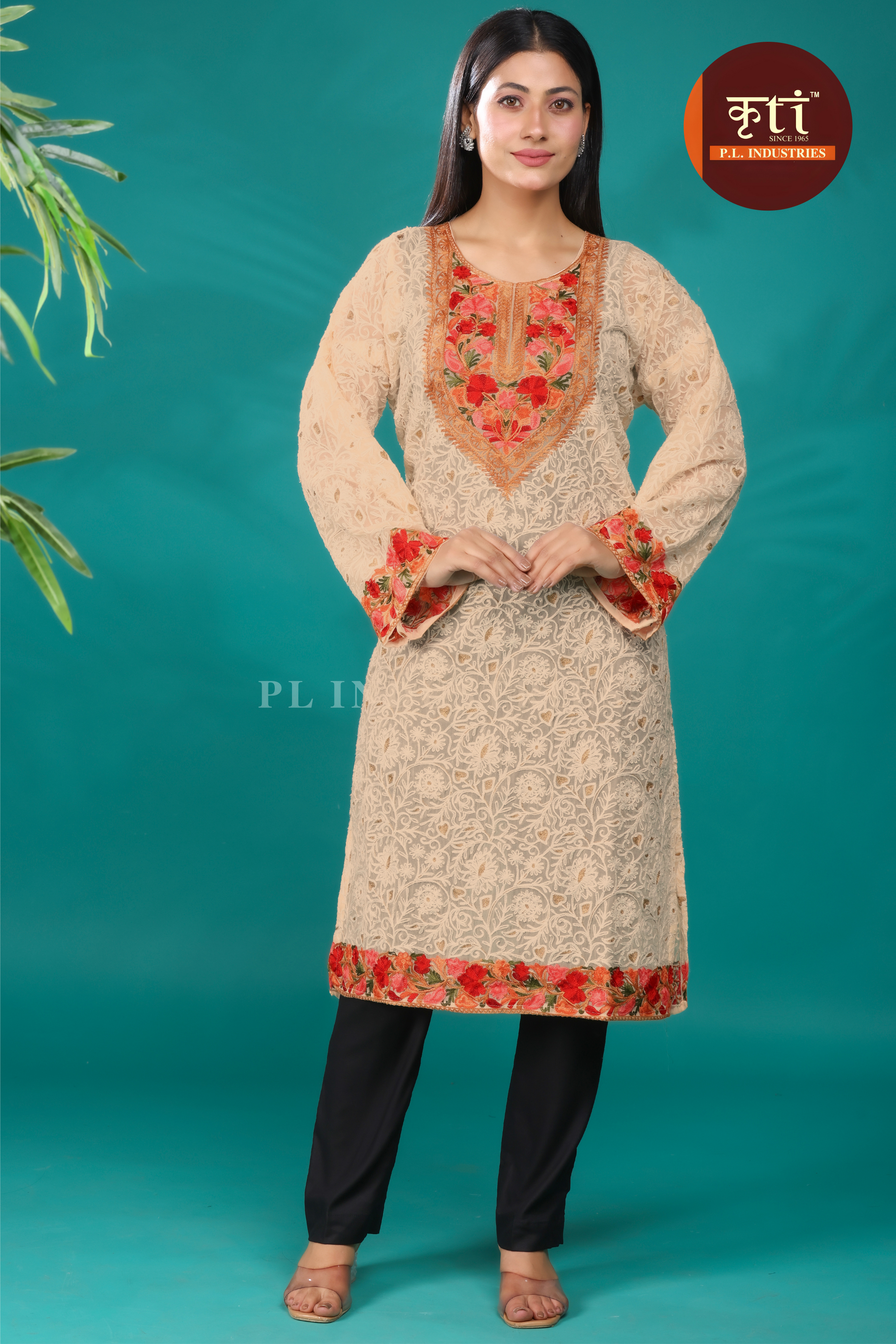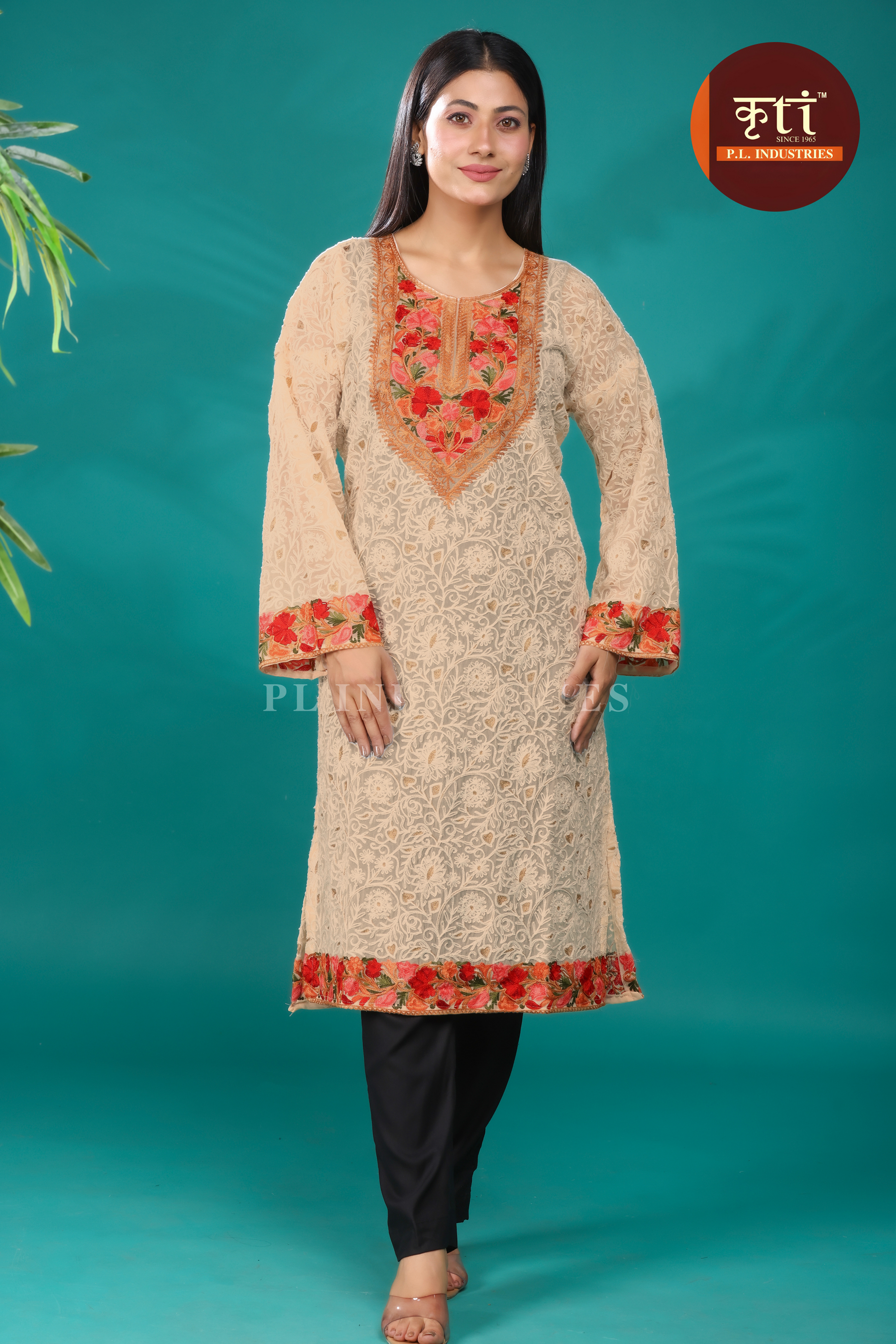 KRITI Kashmiri-Inspired Beige Georgette Kurti Floral Embroidery