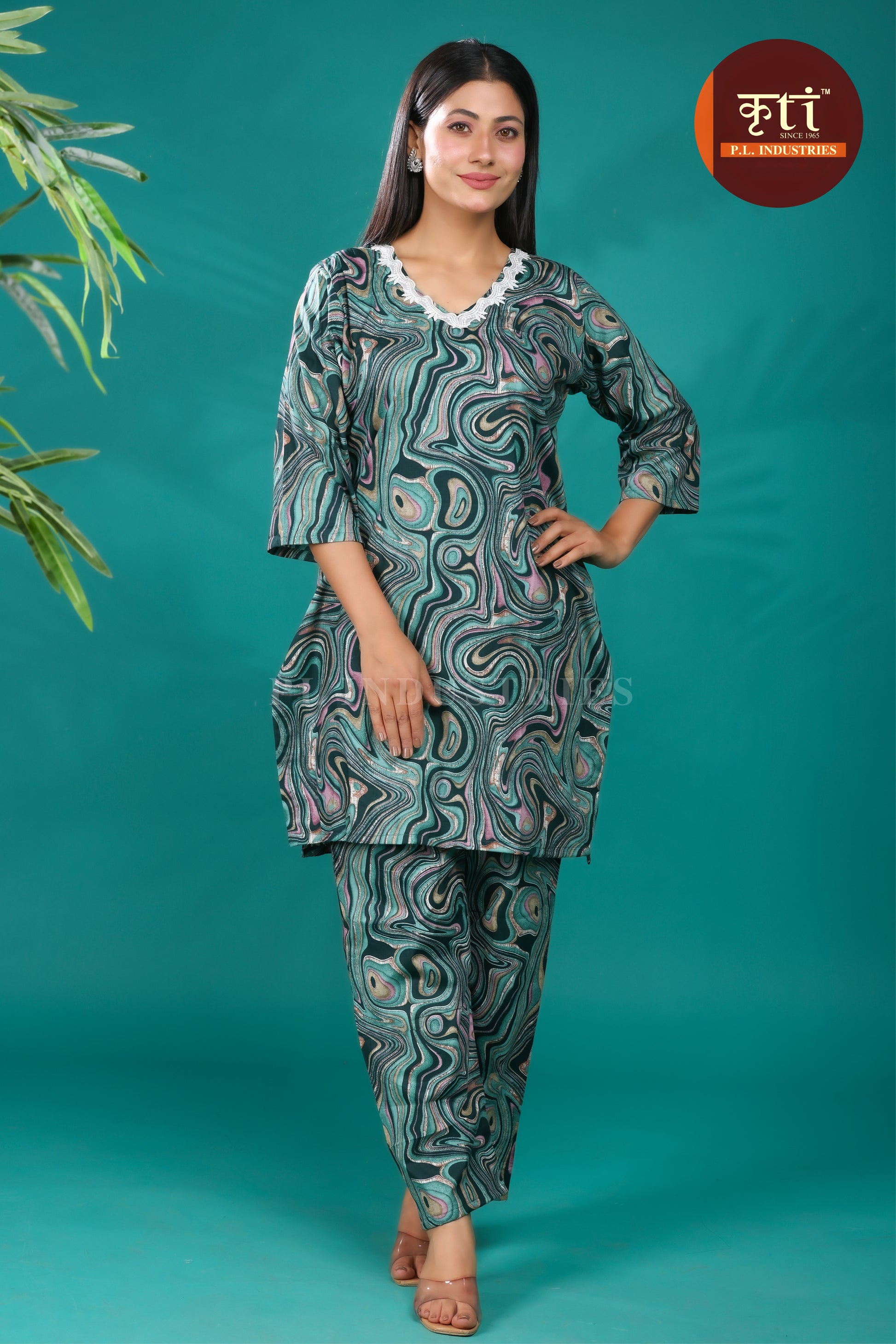 KRITI Abstract Pattern Cotton Cord Set Green For Women